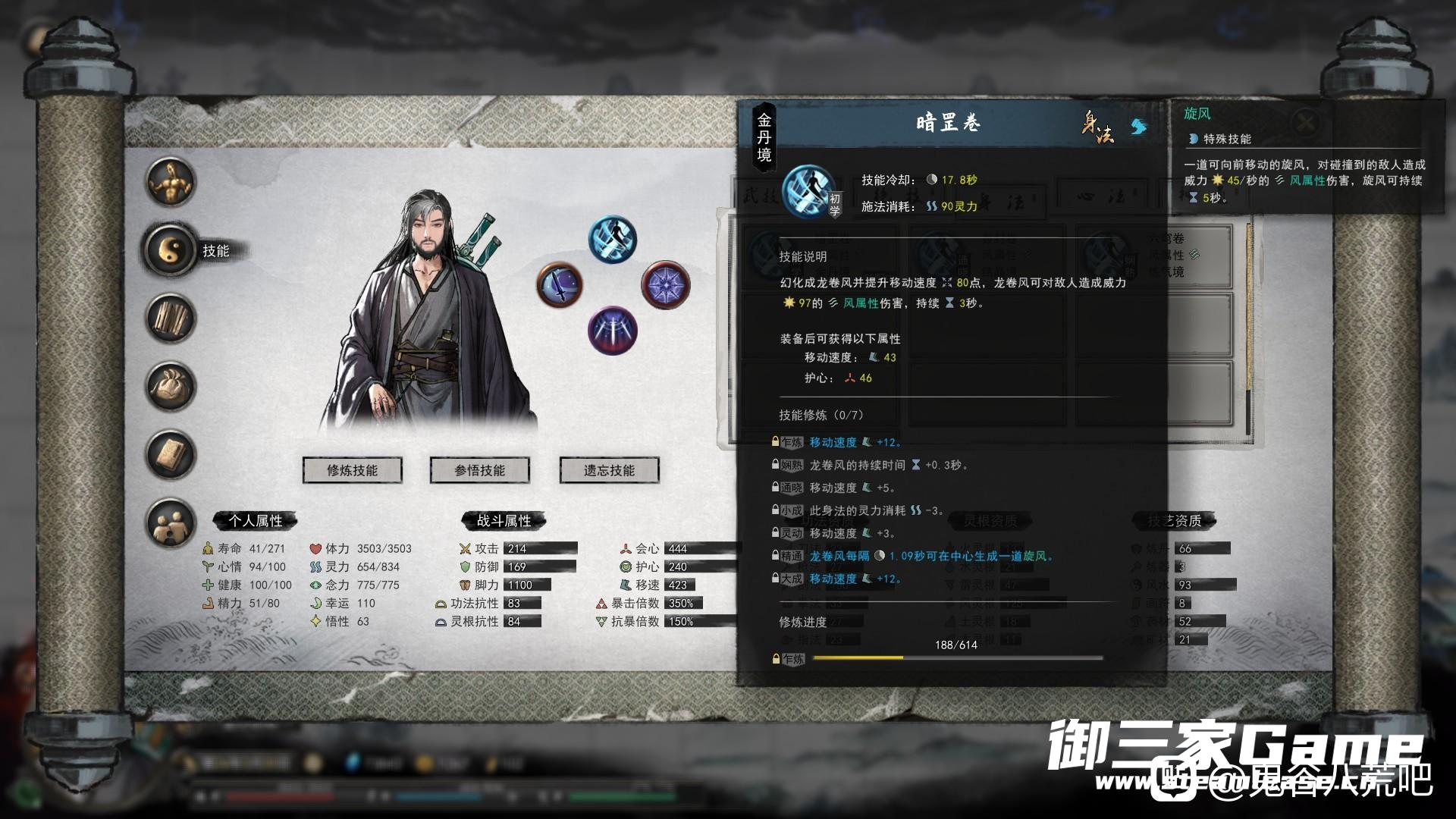 身法很重要,因为关系到神通能不能开出来,(当然也可以选择兵刃专精天赋,但是伤害就少了很多),我选择的是龙卷风身法,配合红色心法的加成,可以做到持续时间15s,冷却时间10s,什么概念,就是你可以无敌十五秒,尽情输出。