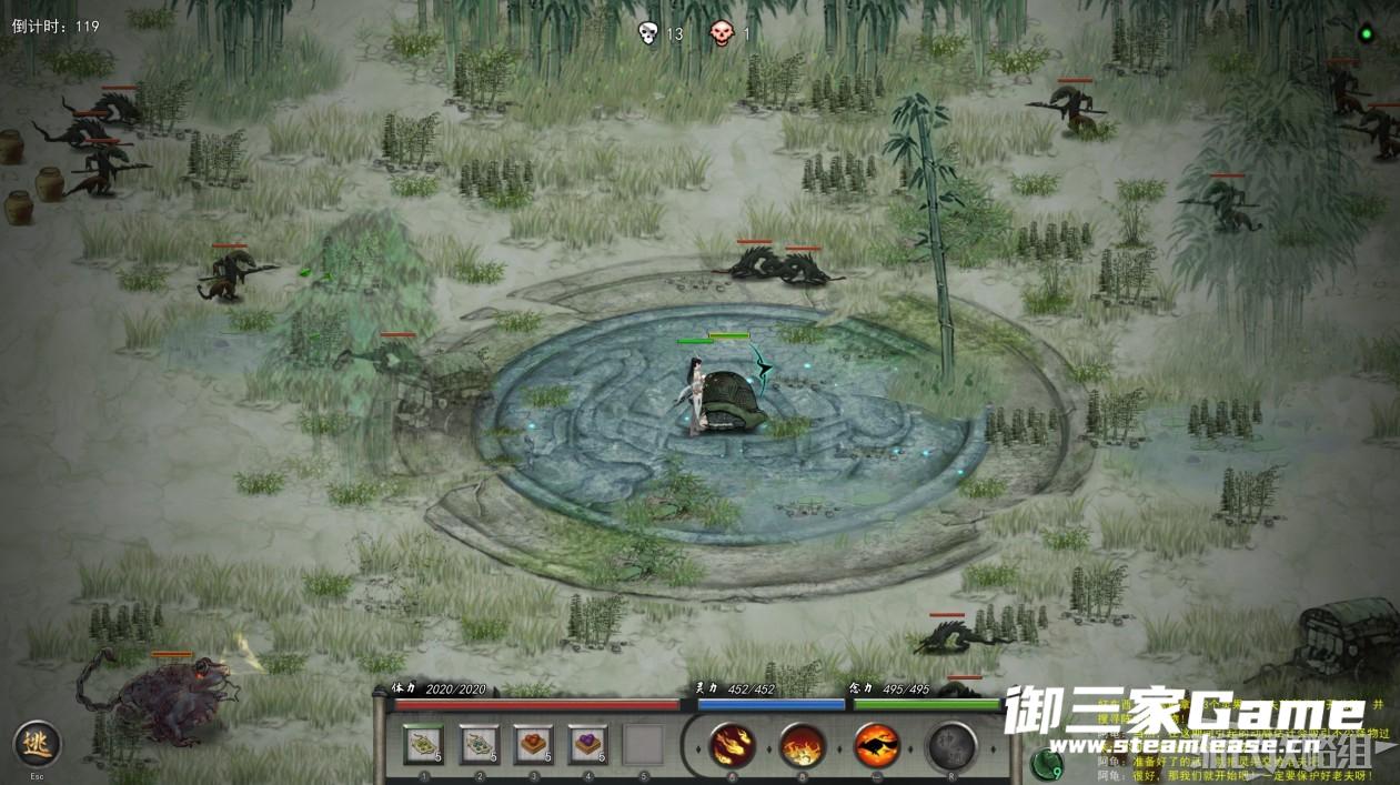 进入残破锁灵阵后将四品灵果交给乌龟,随后它会帮助我们开启大阵,此时会有大量药物进攻乌龟需要我们快速将其消灭。建议在挑战残破锁灵阵前先学习大范围的伤害技能,并且修炼至较高水平。完成残破锁灵阵的挑战后,即可获得天才地宝。