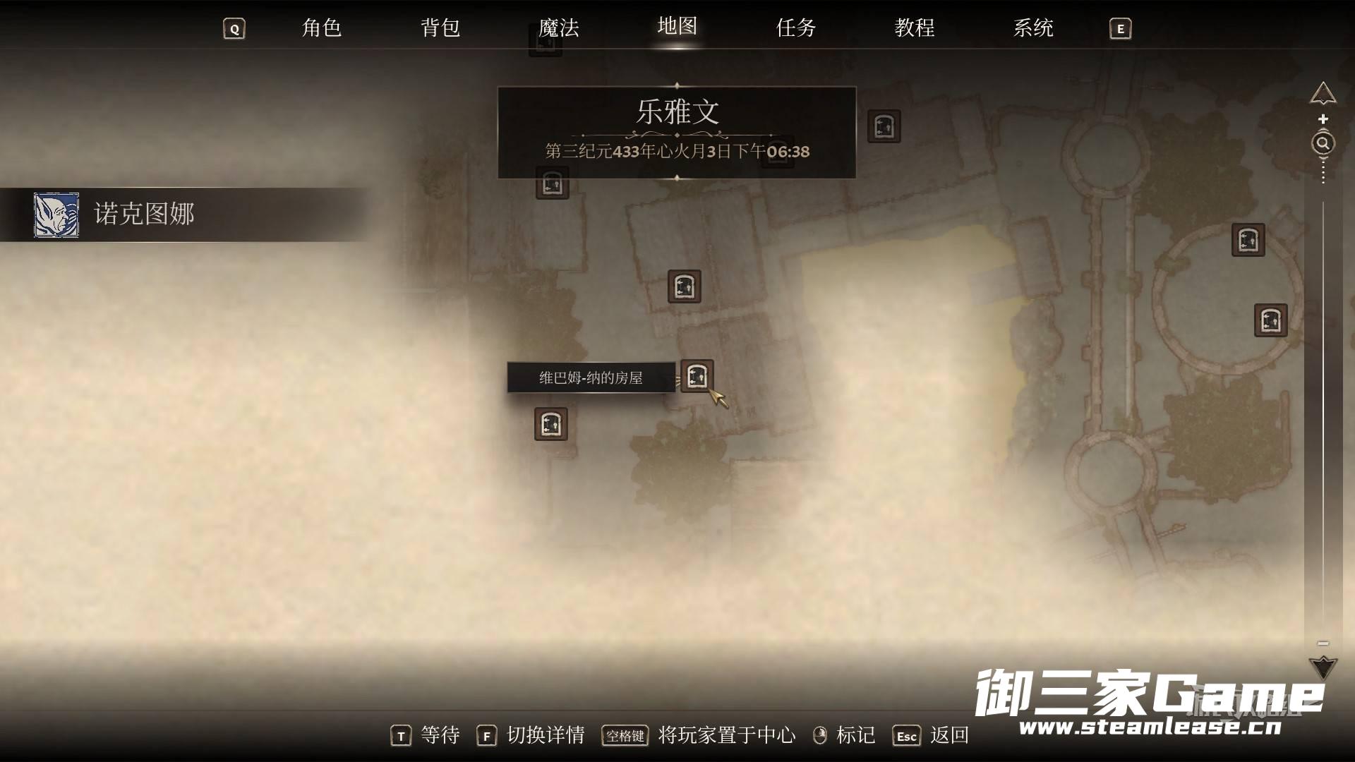 然后传送至乐雅文东大门,在城内找到维巴姆-纳的房屋,注意在进入房屋前一定要保持潜行状态,暗中窃听亚龙人和维巴姆的对话。如果潜行被发现就会导致窃听失败,可以离开房屋并等待数小时后重试,窃听失败不会诺克图娜之眼的获取。成功窃听会得知诺克图娜之眼藏在【潮汐洞穴】。