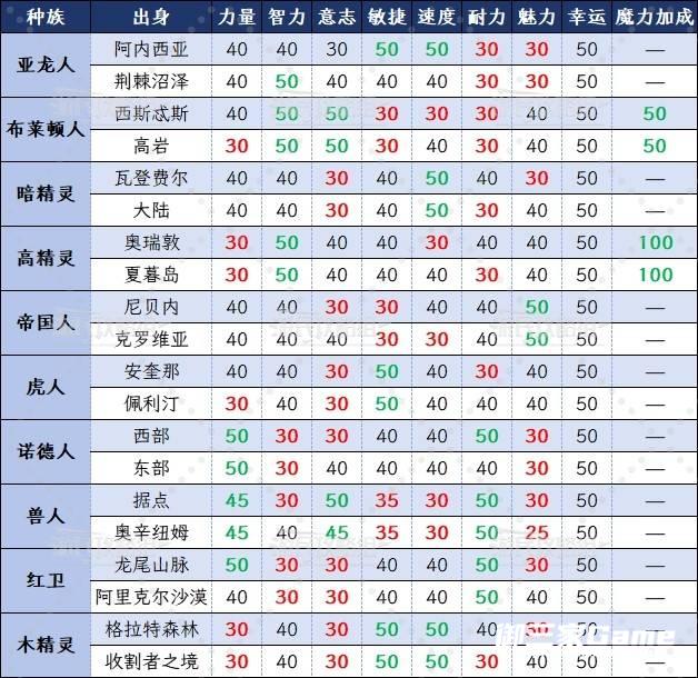 种族总共有10种,每个种族包含2个出身,各种族属性加成数值如下。