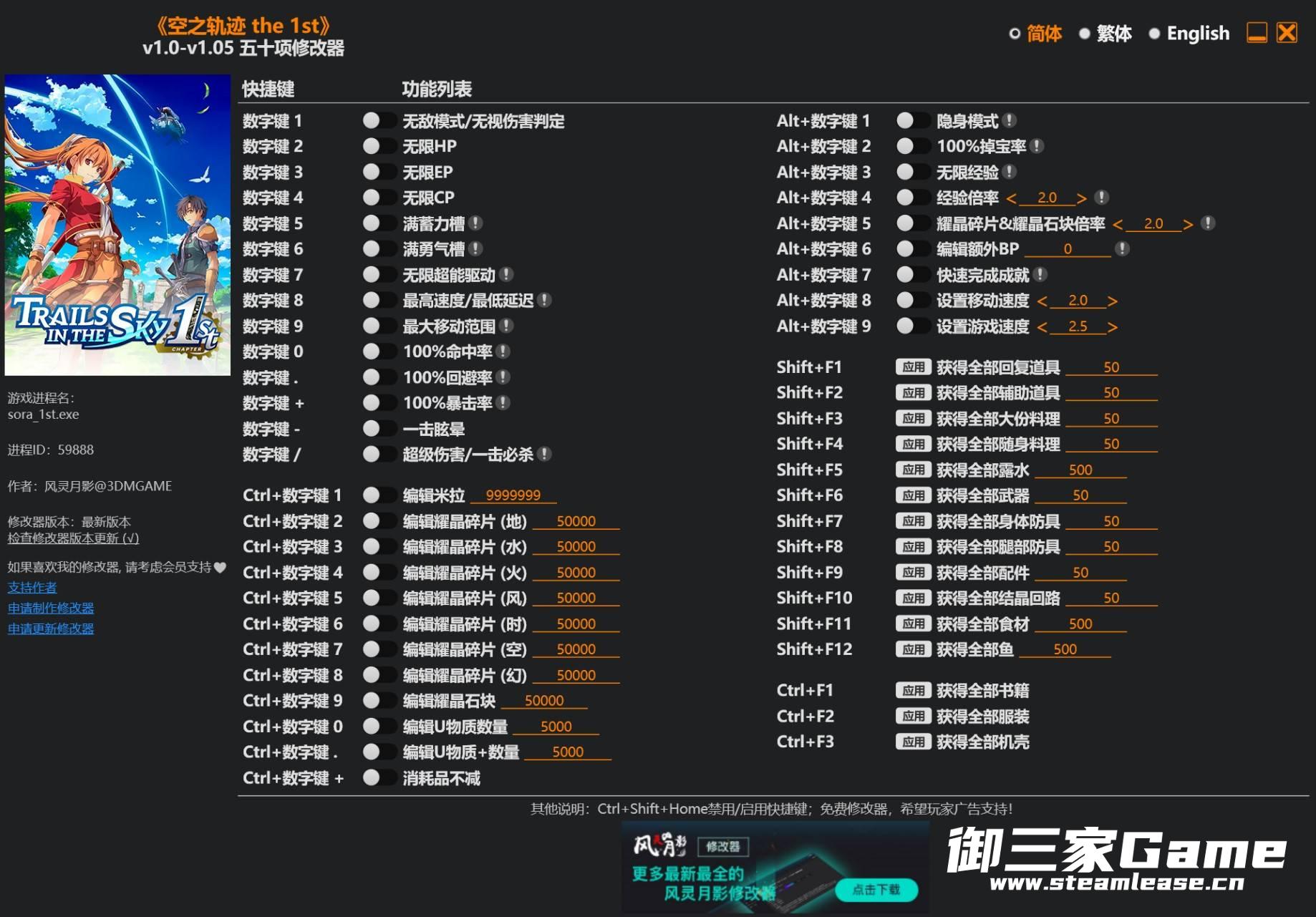 《空之轨迹1st》玩家可以通过修改器来修改游戏中HP、材料数量及经验值等参数,大幅降低游戏难度,下面请看由“风灵月影”为大家带来的《空之轨迹1st》风灵月影修改器分享,希望可以帮助到大家。