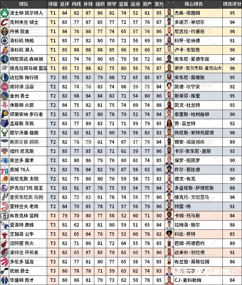 《NBA2K26》中根据球员评分可以为球队的实力评级,今天就为大家分享一下《NBA2K26》全球队评级及球员评分,根据每支球队的评分前8名球员的平均分来为球队实力排名,一起来了解一下吧。