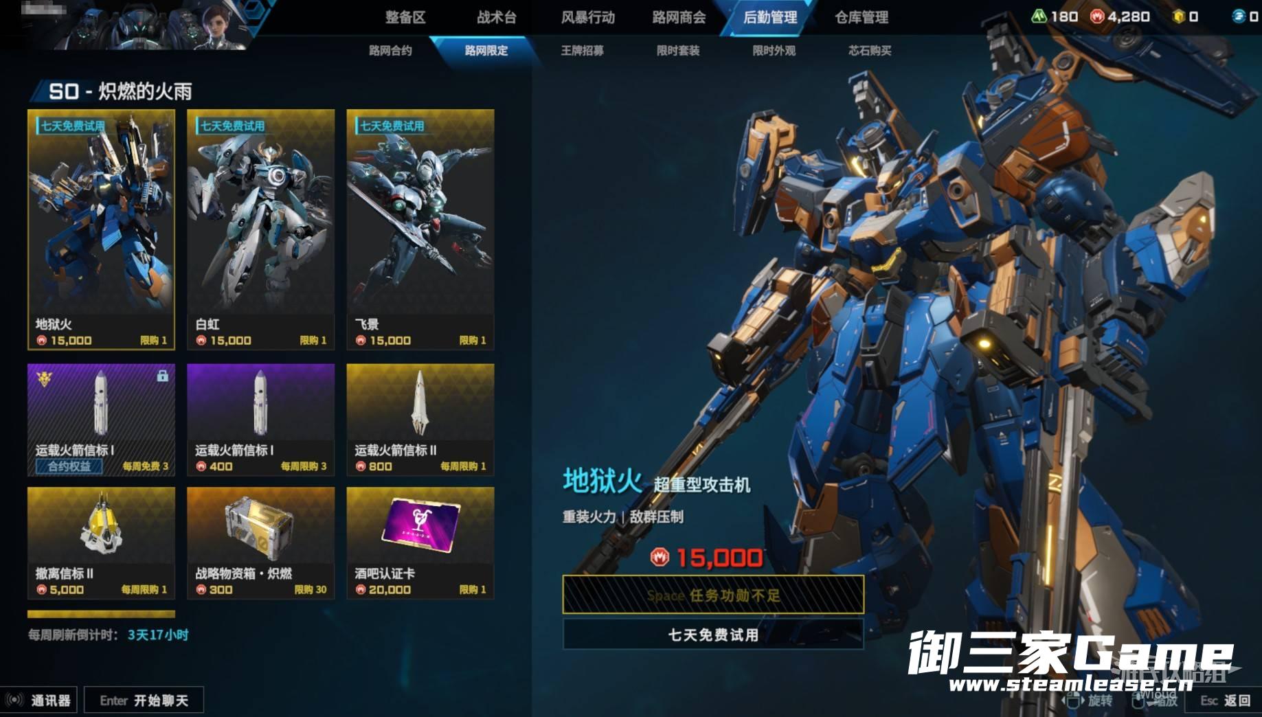 任务功勋可在【后勤管理】的【路网限定】页面购买机兵以及其他道具。