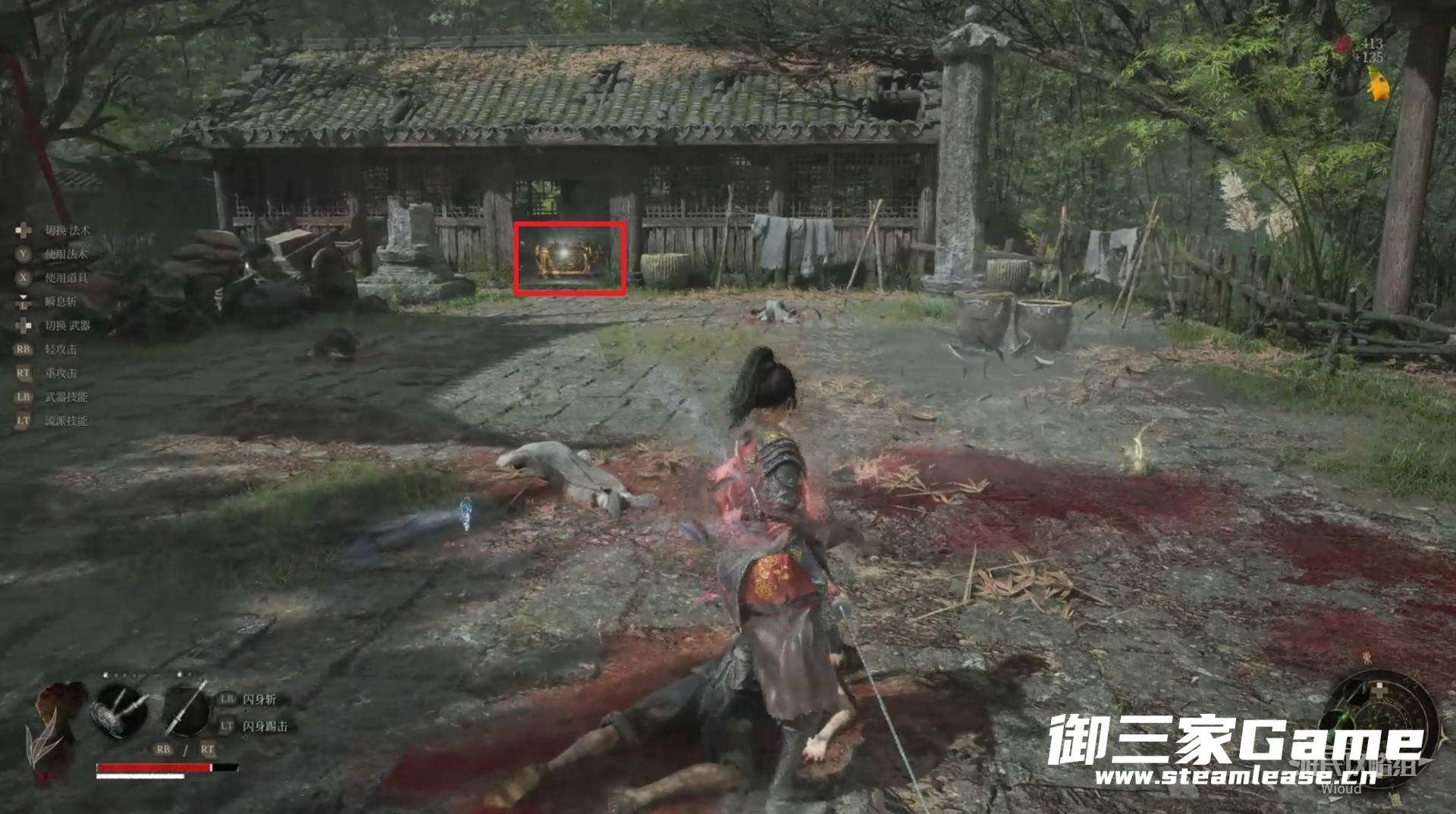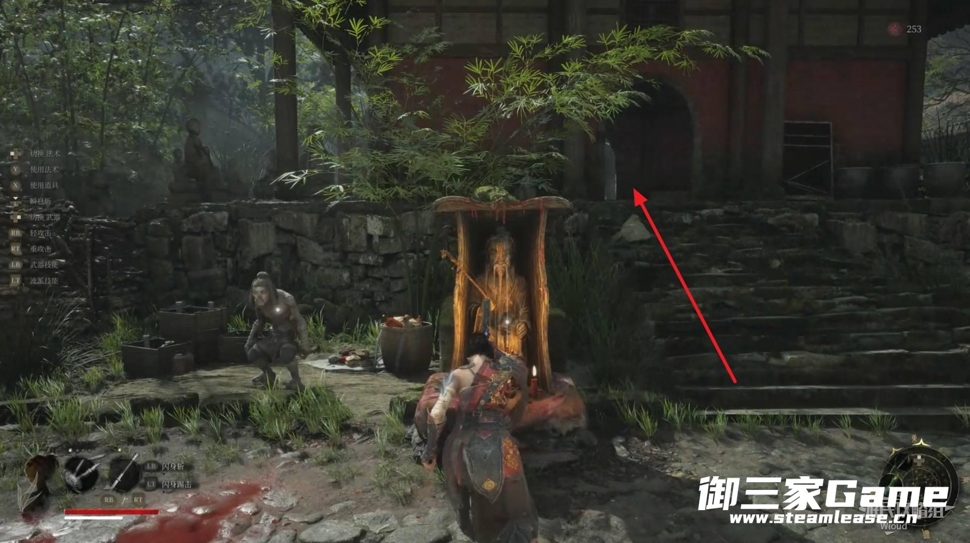 从第一个地图【佛源镇】第三个篝火【含光禅院】出发,面对神龛穿过前方拱门进入一个院子。