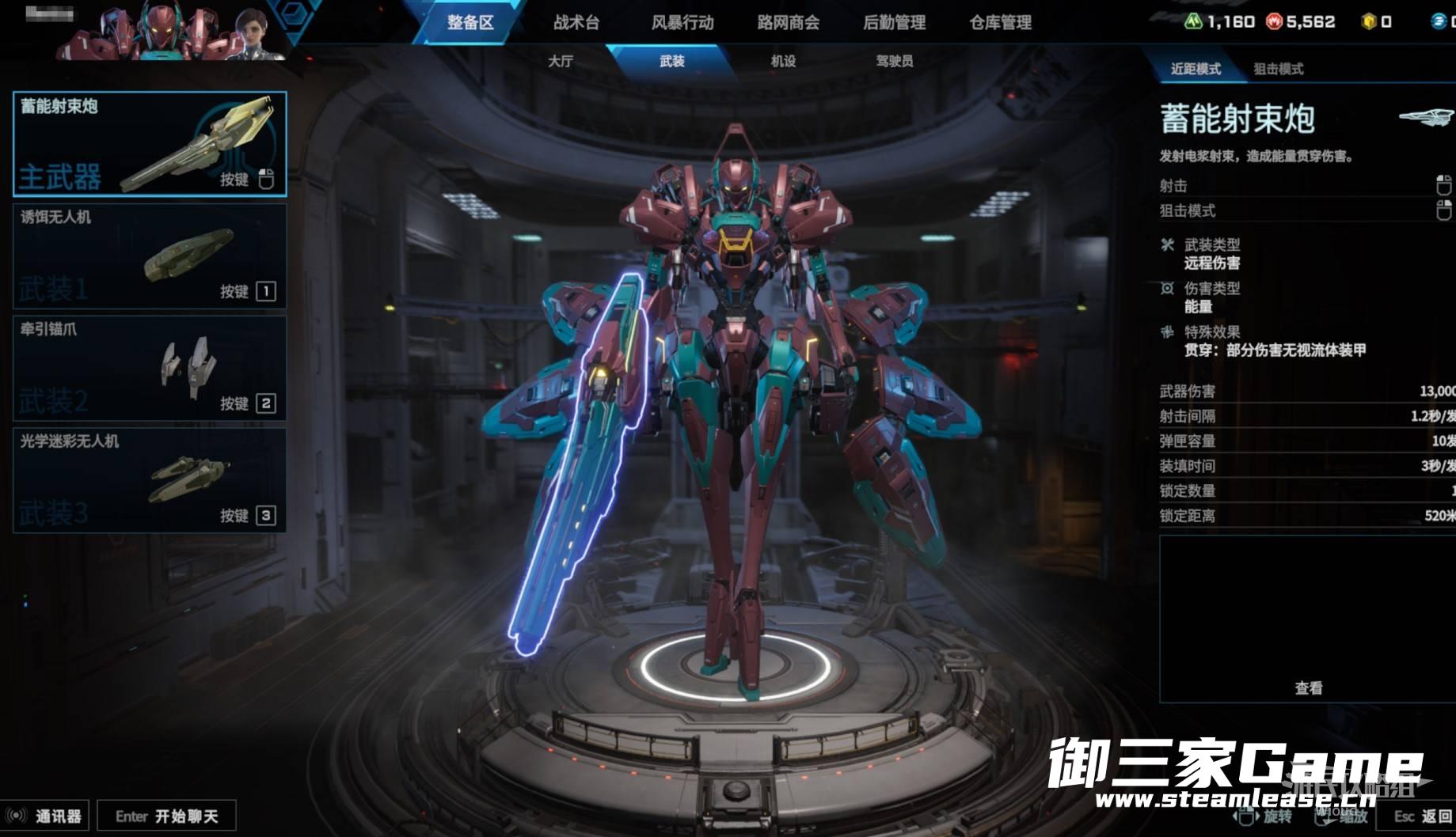 鸣神武器与武装比较简单,主武器为蓄能射束炮,可腰射可瞄准,只有瞄准时可蓄力,最多蓄力到300%,腰射与瞄准都可通过自瞄锁定敌人,腰射锁定距离为520米,瞄准锁定距离为1100米。