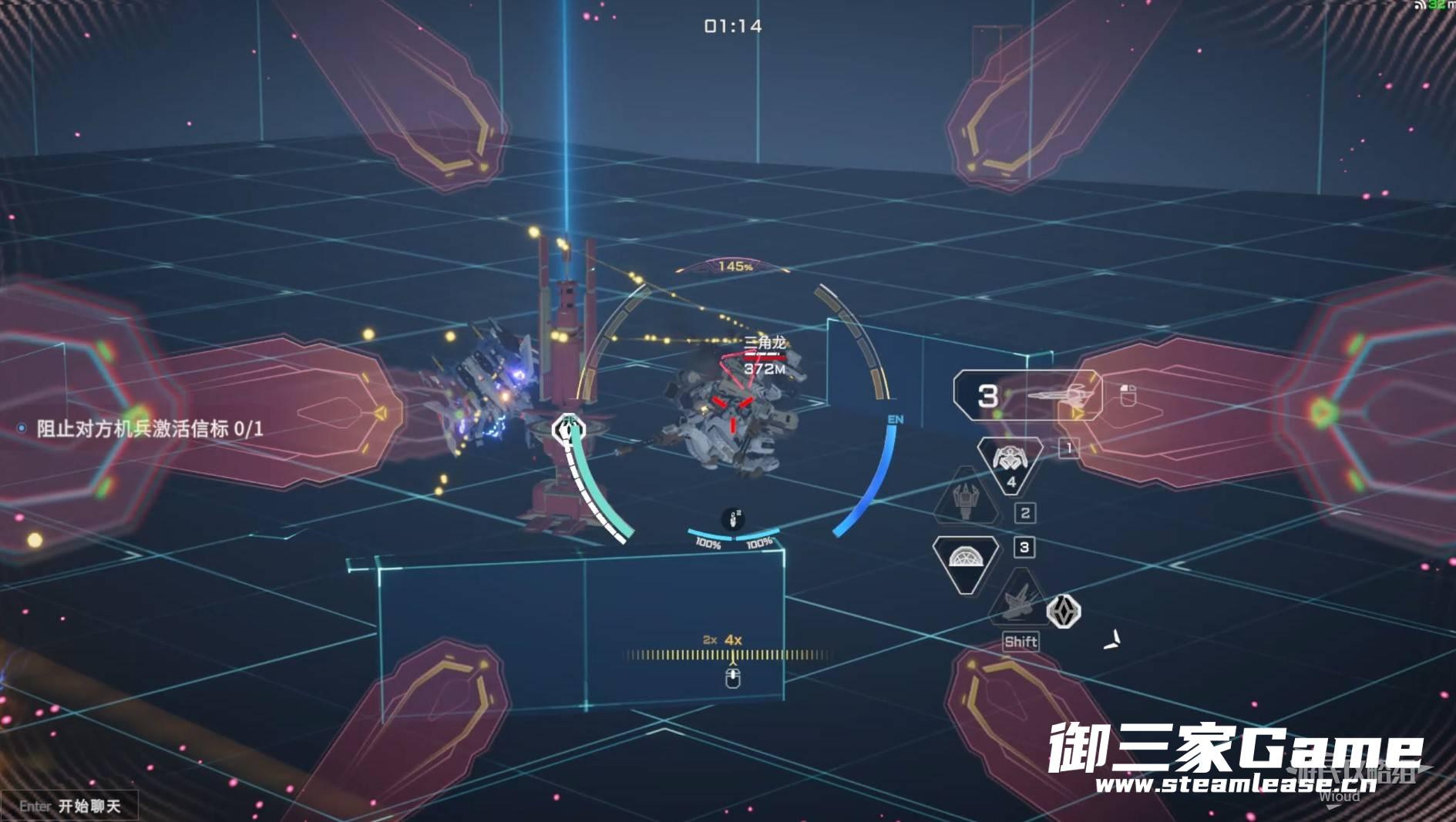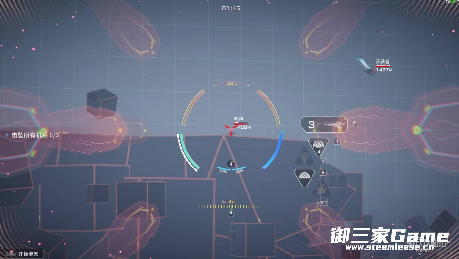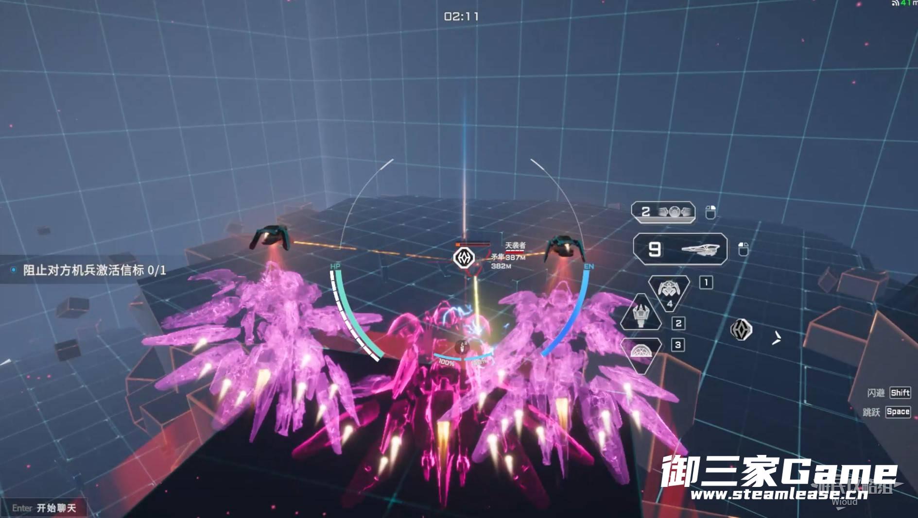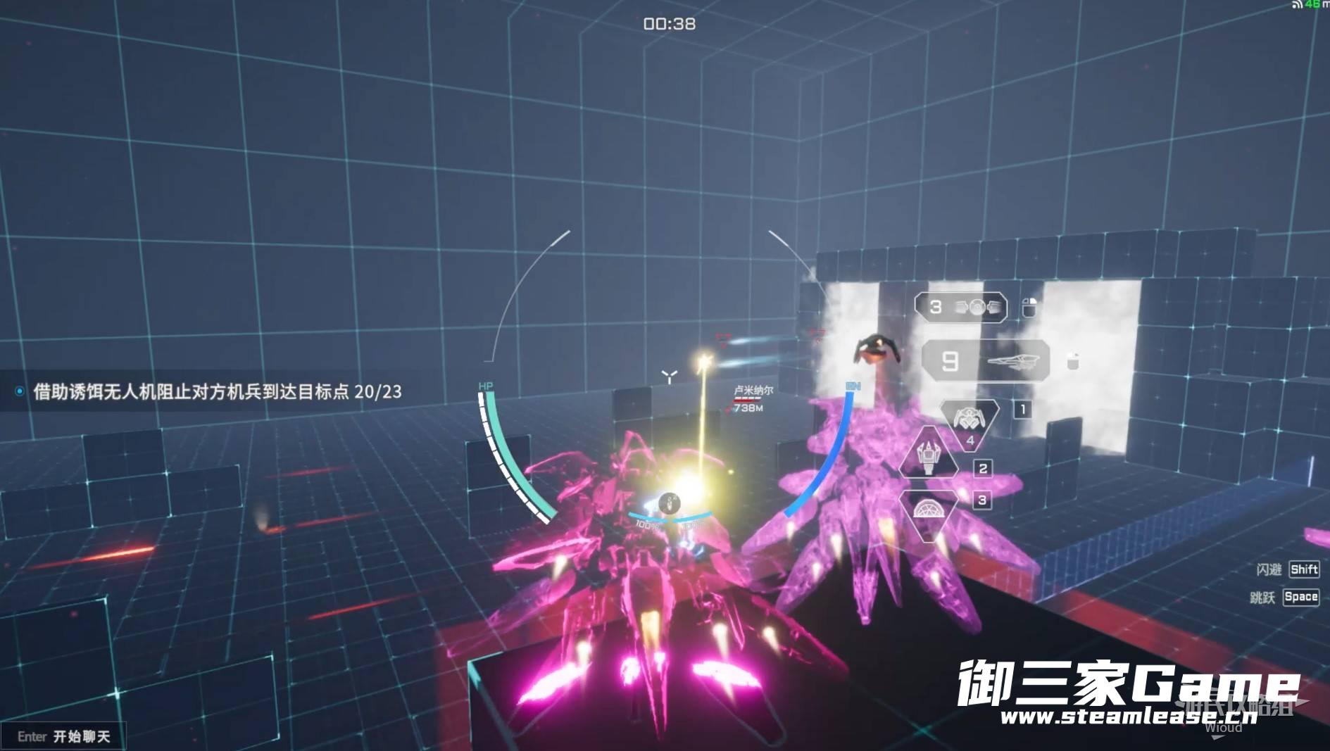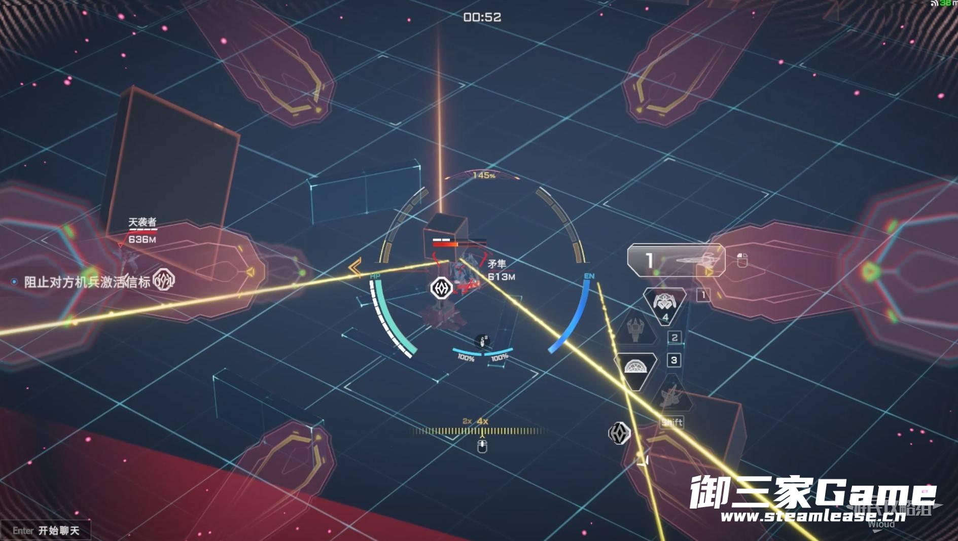 先原地放置2个诱饵无人机,瞄准对面鸣神的位置顺便积累能量,鸣神会一直切换位置,但它攻击的时候会现身且原地不动,抓住这个机会干掉它。