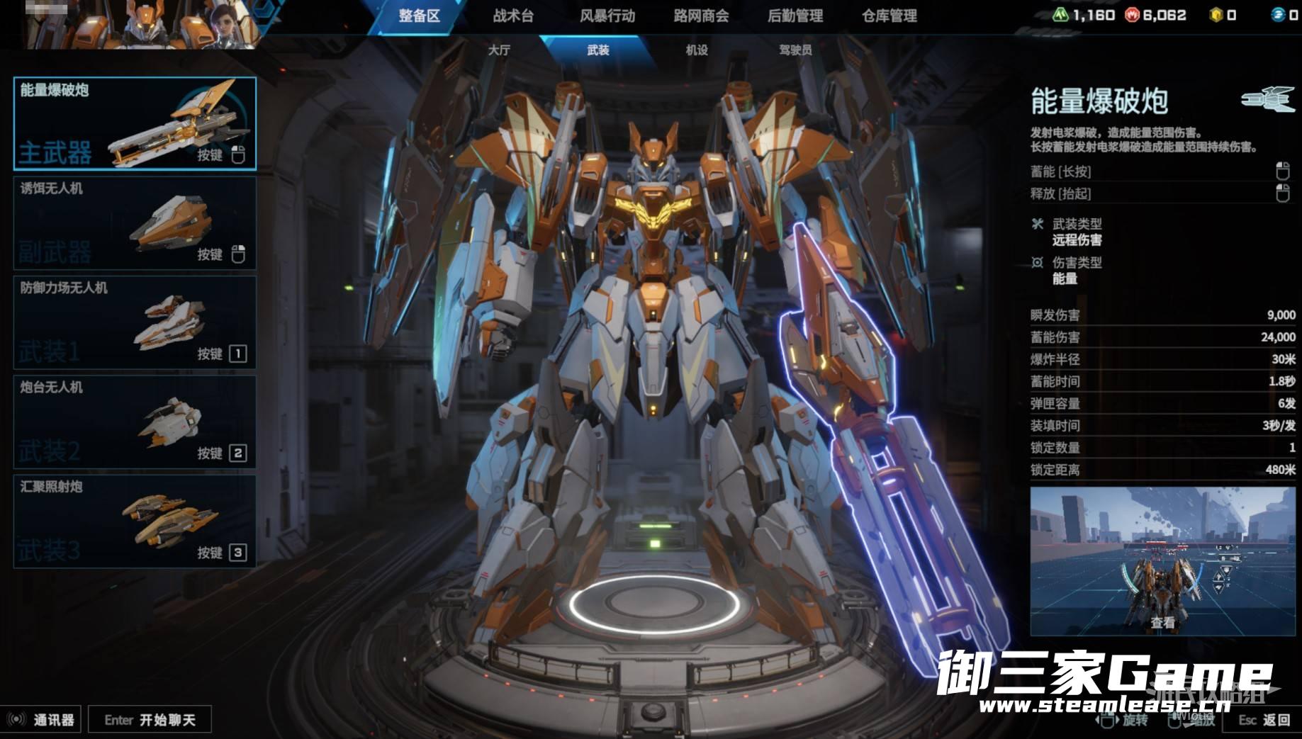 主武器能量爆破炮可对敌人造成范围能量伤害,蓄力发射使能量球在敌人身旁停滞一点时间造成持续伤害。