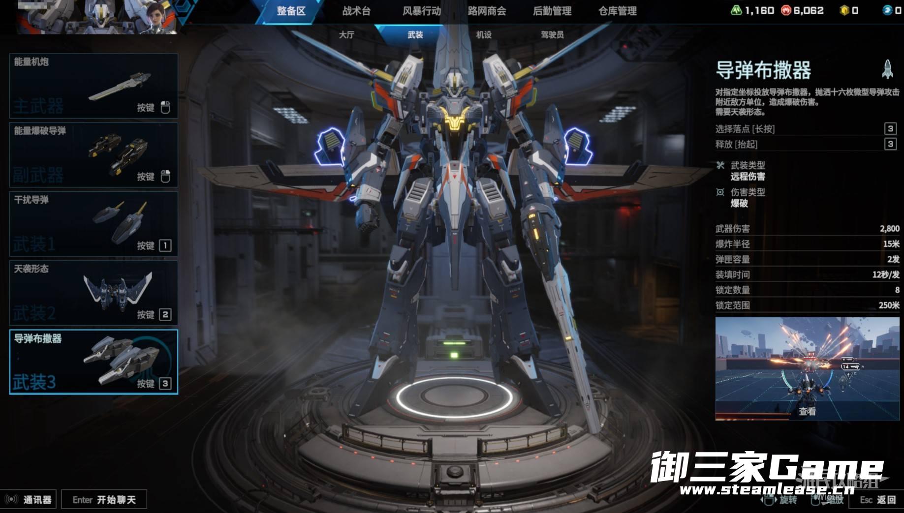 武装1为干扰导弹,一次可发射6枚干扰导弹,导弹爆炸会产生球状烟雾,使敌人的锁定失效。