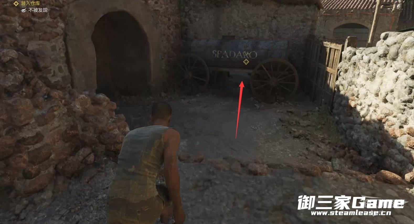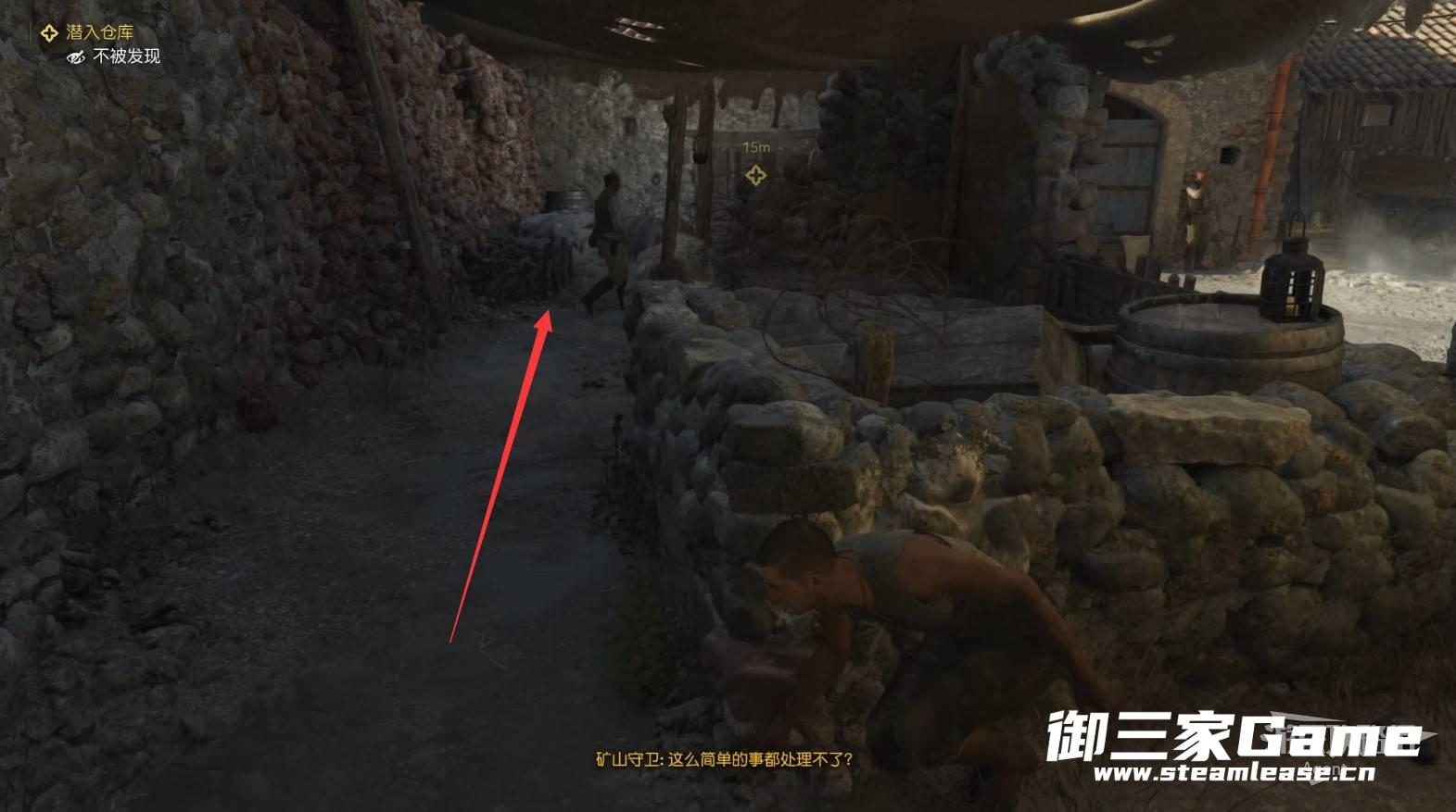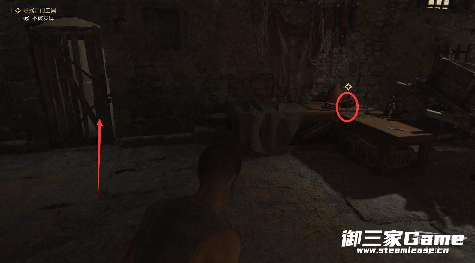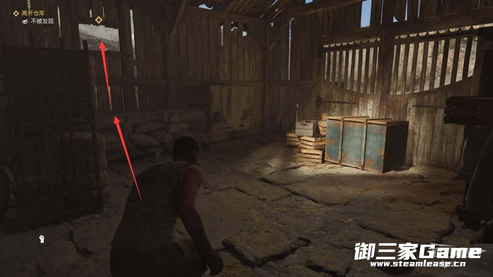钻过洞,等守卫离开后再往前走,开门进屋。