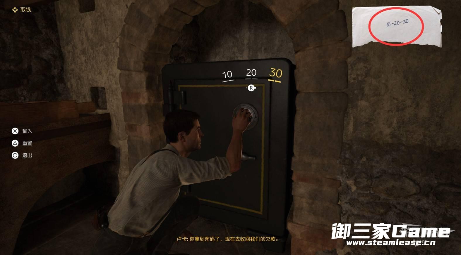 输入密码10-20-30打开保险箱拿到钱。