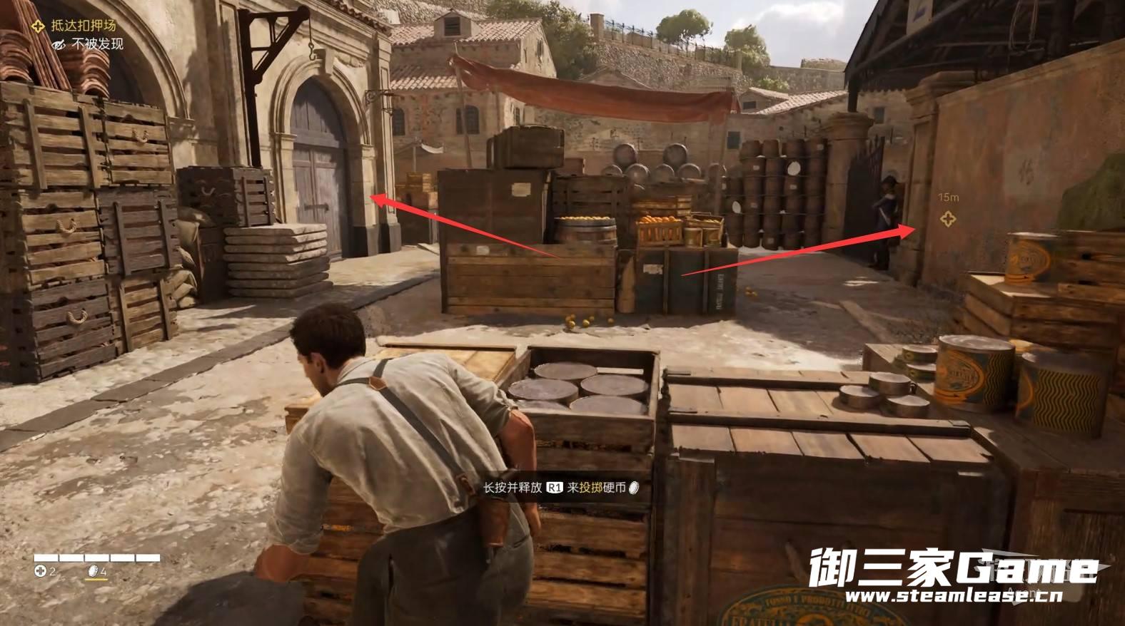 在里昂的帮助下,跟随切萨雷到河道里,翻墙潜入后,投掷硬币引开仓库门口的守卫然后勒晕。