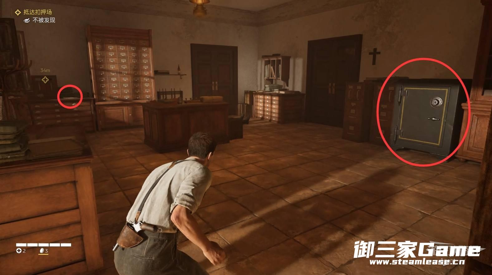 先去左边办公室里有个保险箱,等下再回来进入右边的仓库。