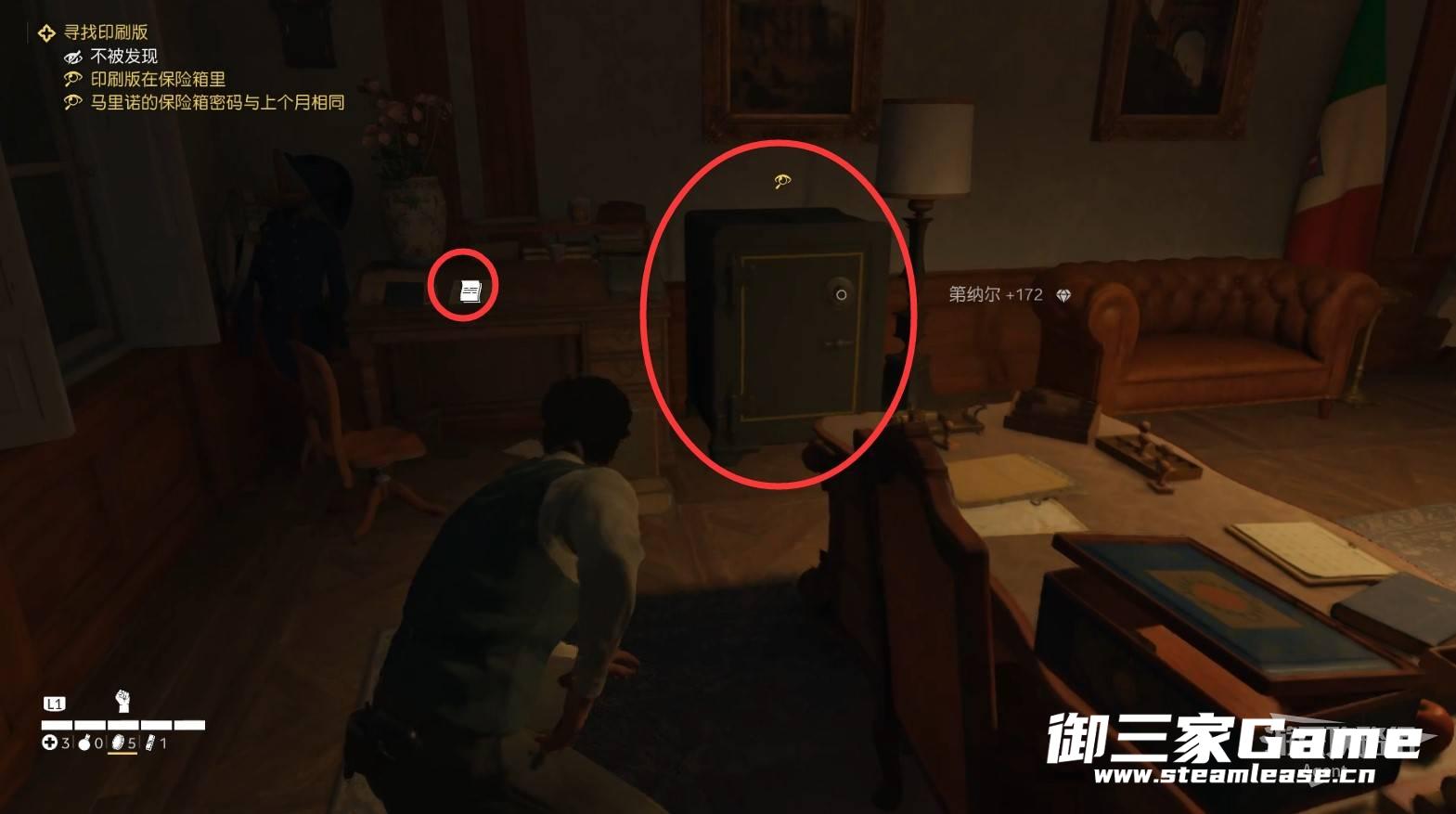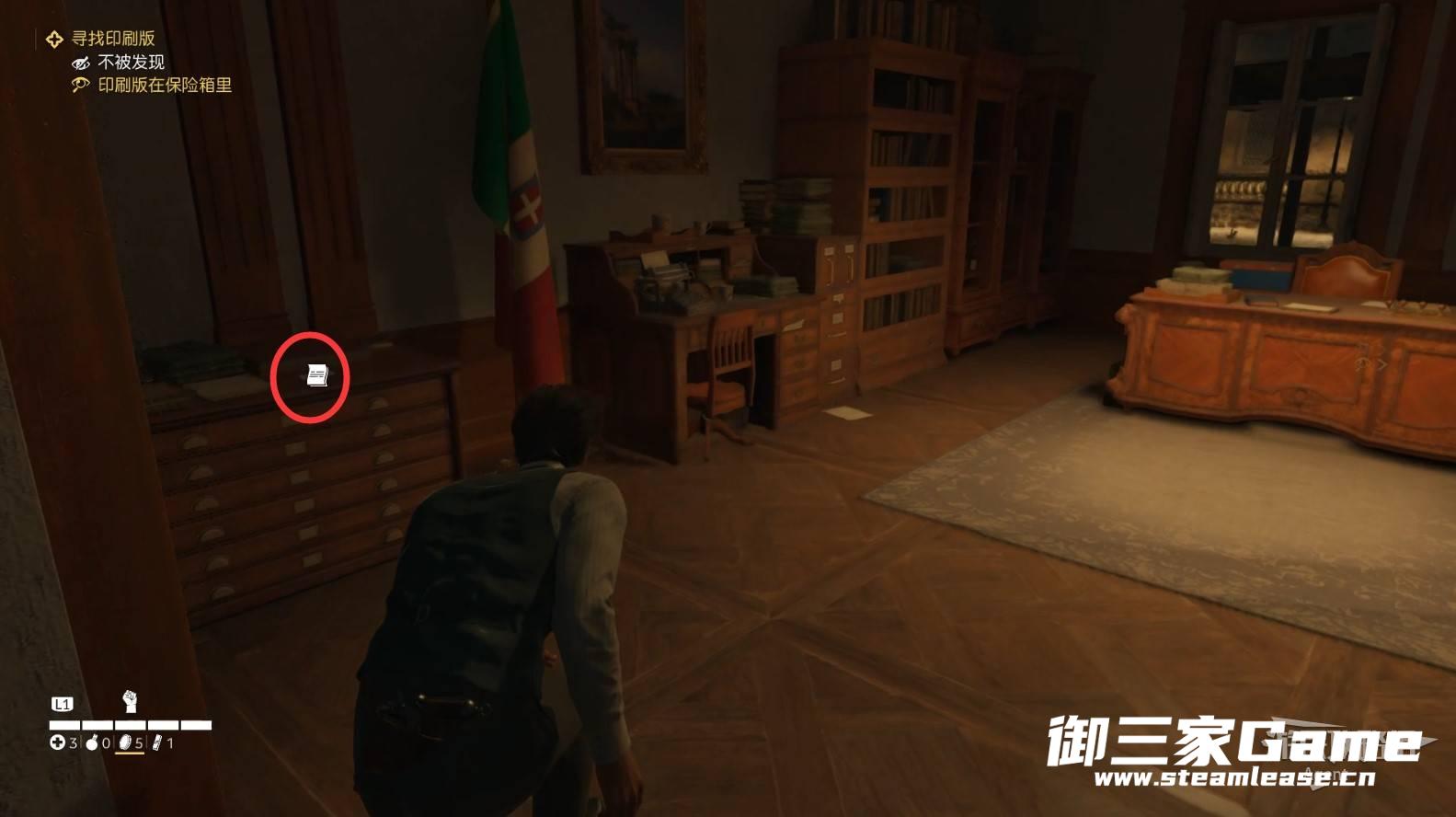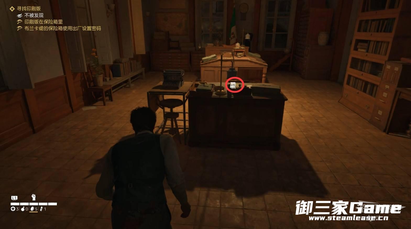 在地下牢房救出朱塞佩后,进入大楼,看桌上的文件,得知印刷版在保险箱里。