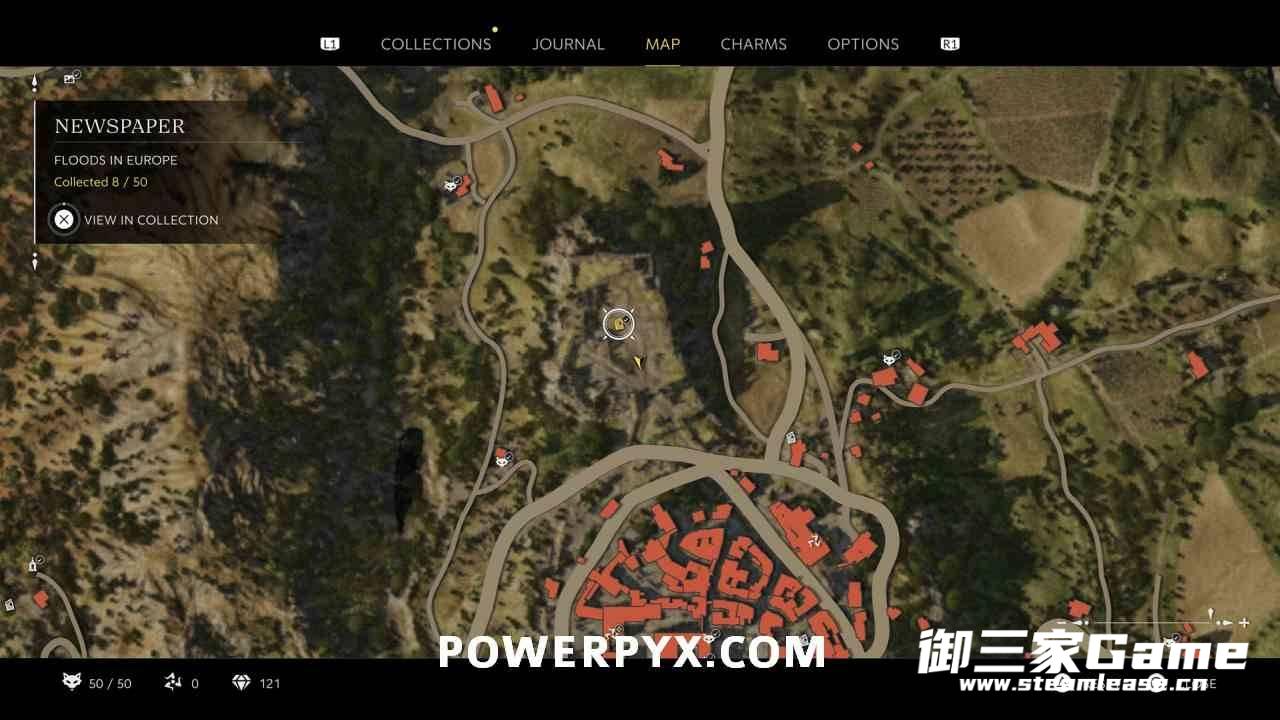 角色靠近收集品所在位置时,地图上会以白色图标标记显示其具体位置,已经找到的收集品也会有相应的勾选标记。