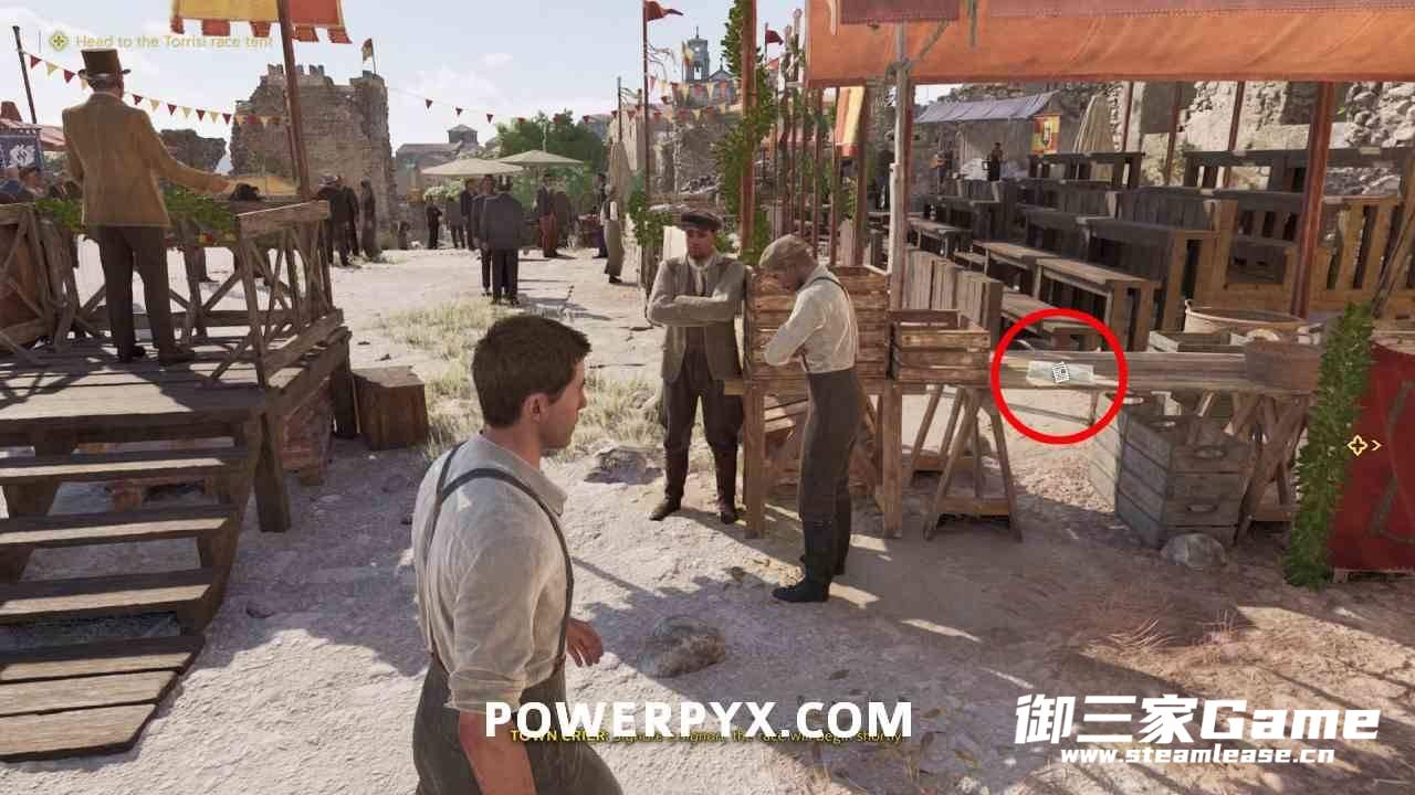 骑马到阿迪圣塞莱斯特后,进入一堆有许多帐篷的区域,这里正在为赛马节活动做准备,先不要进入左侧有黄色目标标记的白色帐篷,在白色帐篷前的左边可以看到这份报纸。注意与白色帐篷互动将离开此区域,想要返回的话就需要通过【章节重玩】来重新回到此区域。