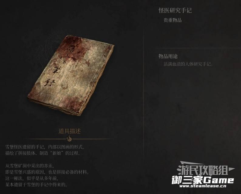 楼下桌上拿到【贵重物品】怪医研究手记。旁边是个从这一侧打不开的门。