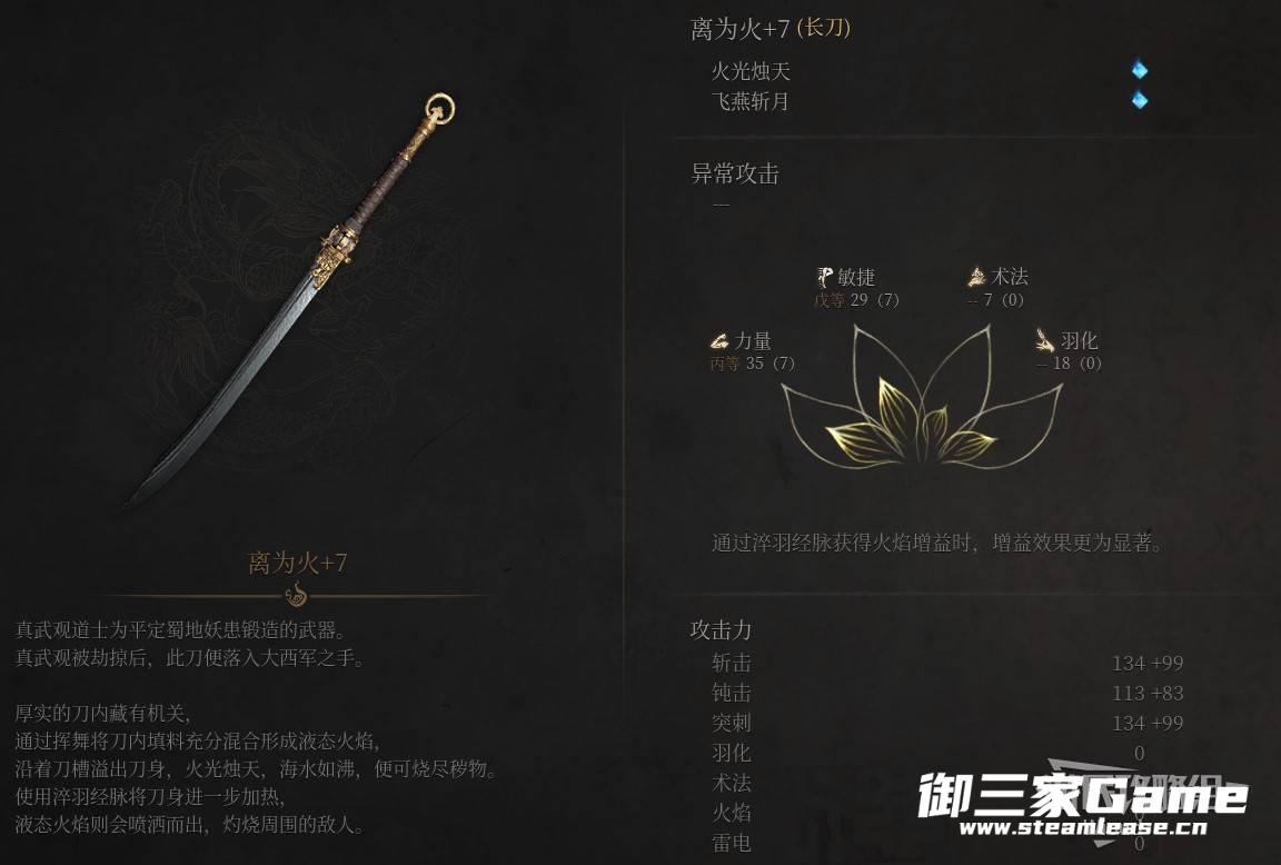 核心必带【羽骨砭·火焰】,这里需要重点确认一遍,只有火焰附魔的情况下才会触发【离为火】的武器技能强化效果。