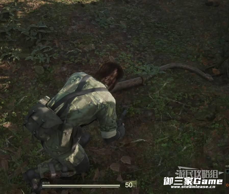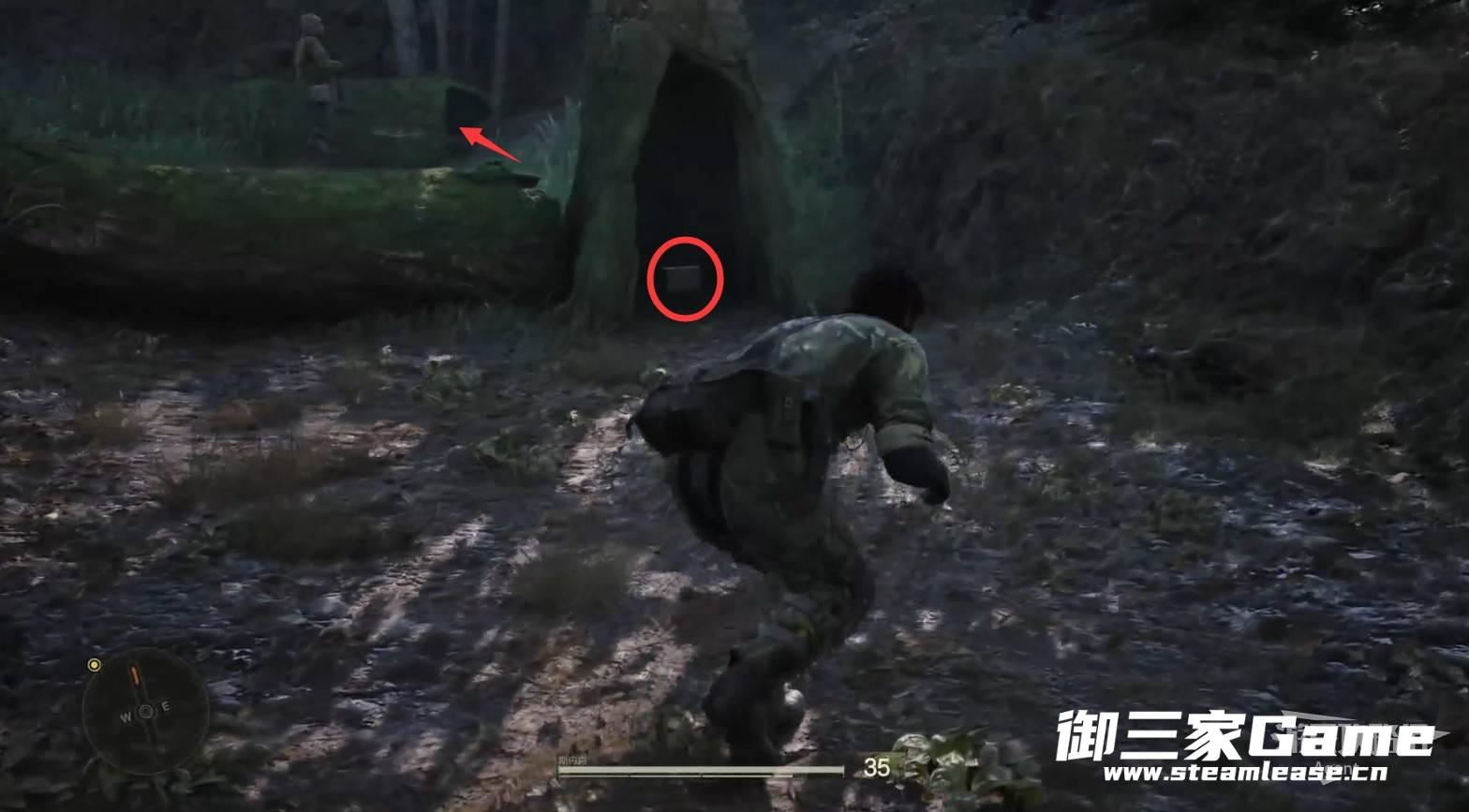 先去左右两侧搜刮下物资,然后再回到中间,趴在地上从树干下钻过。