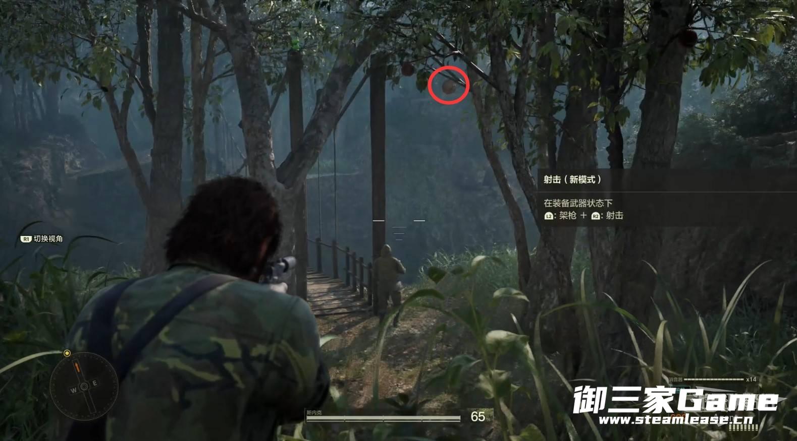 继续往北走,来到吊桥,把树上的蜂巢射下来,蜜蜂会帮你赶走敌人,还会掉落蜂巢等物资。