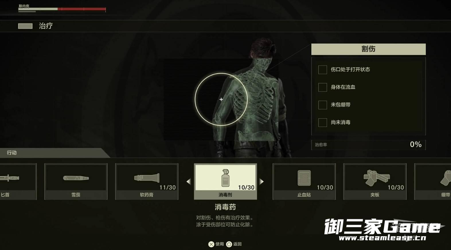 受重伤后需要治疗,处理多处伤口。针对不同的伤要用不同的药,选中所需的药即可,不用考虑顺序。