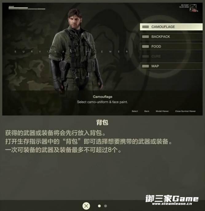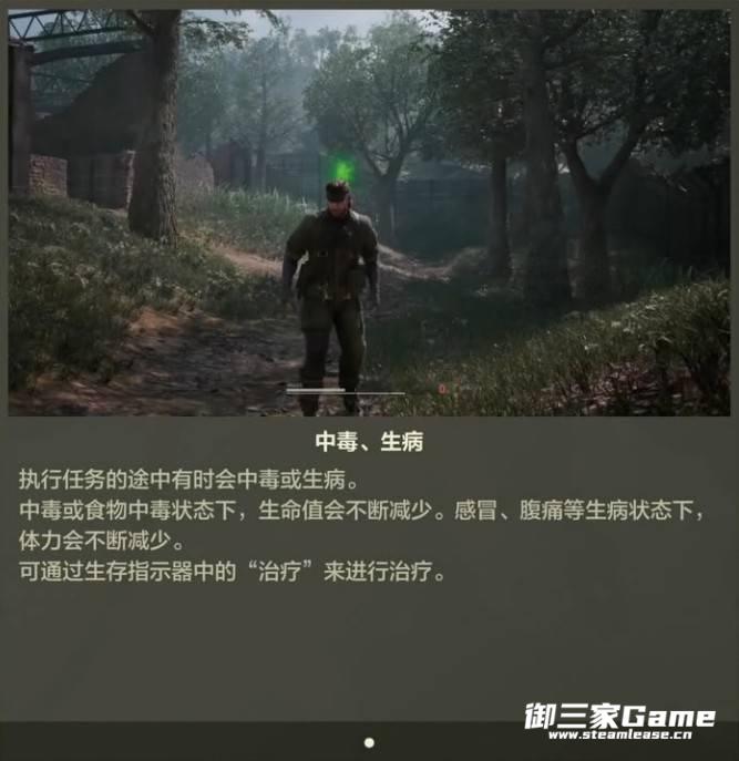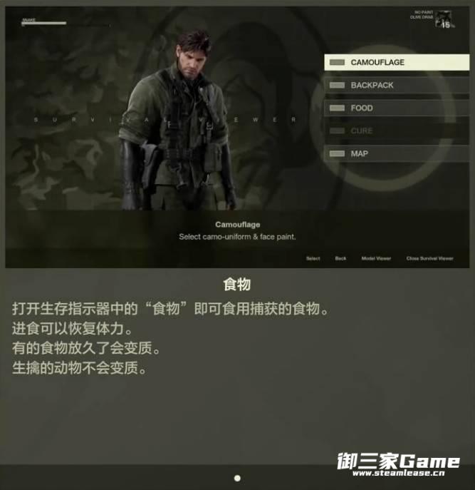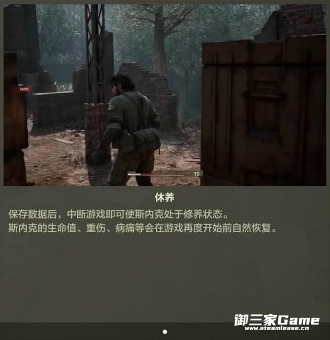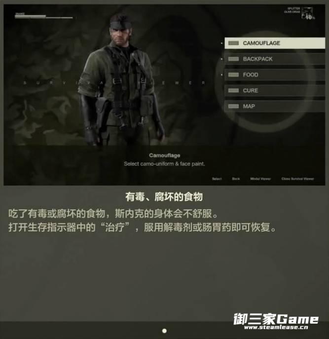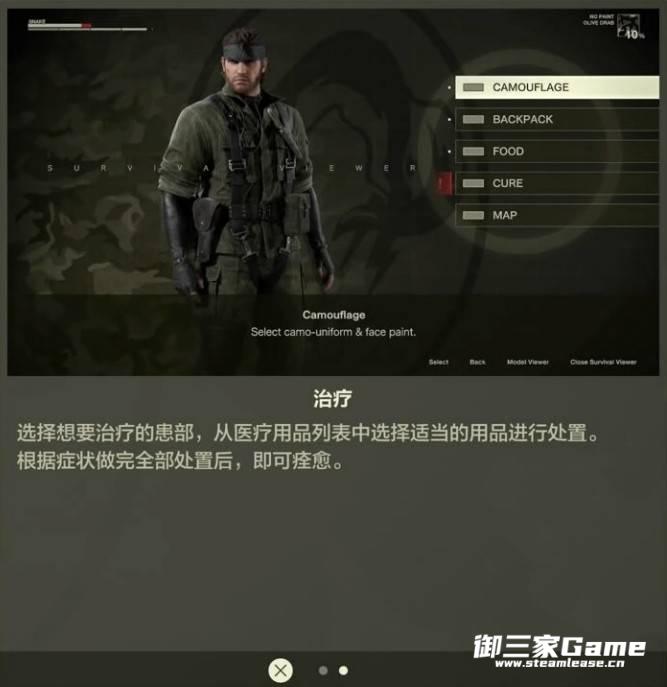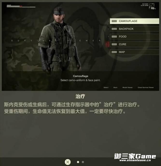 斯内克受伤或生病后,可通过生存指示器中的“治疗”进行治疗。