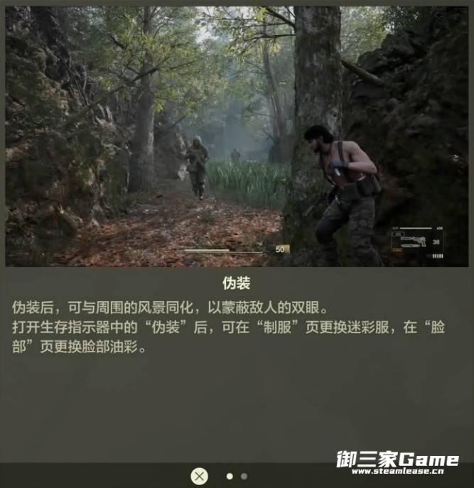 打开生存指示器中的“伪装”后,可在“制服”页更换迷彩服,在“脸部”页更换脸部油彩。