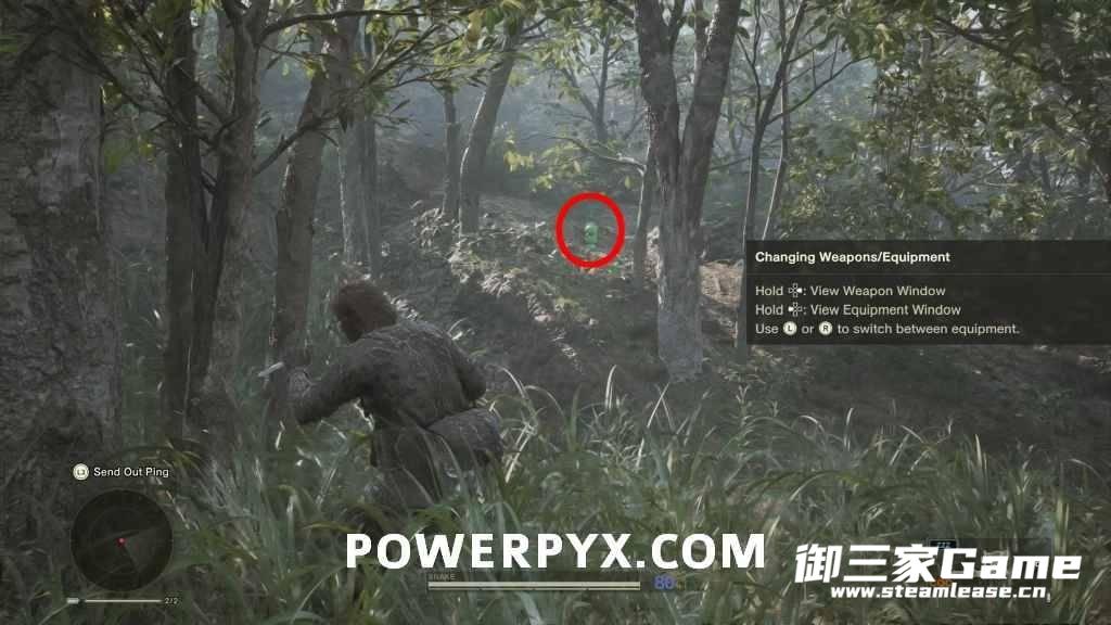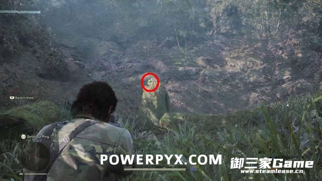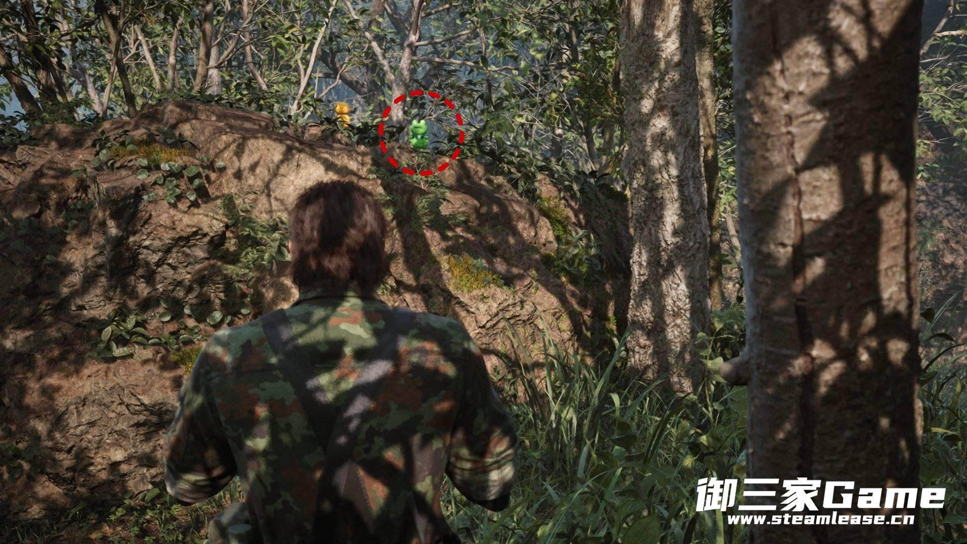 拿回背包后回到此区域起点,沿着东侧山坡上山顶。面对之前挂着背包的树往左看,可以在岩石上看到科罗蛙,旁边还有一只小黄鸭。收集可解锁【呱呱(攻击科罗蛙)】奖杯或成就。