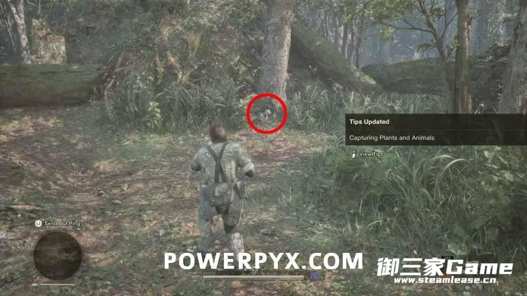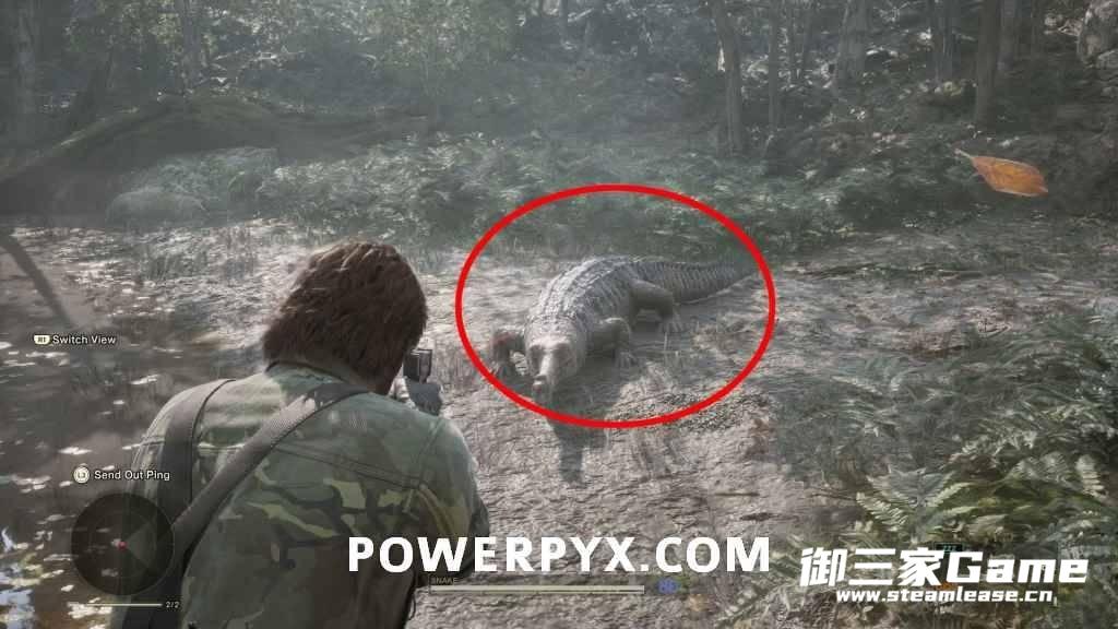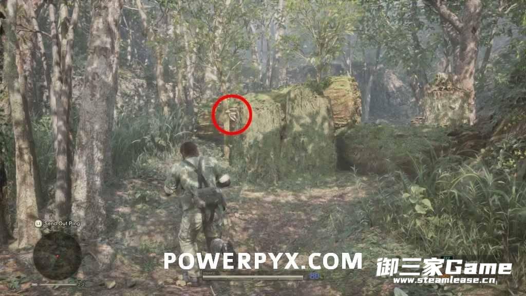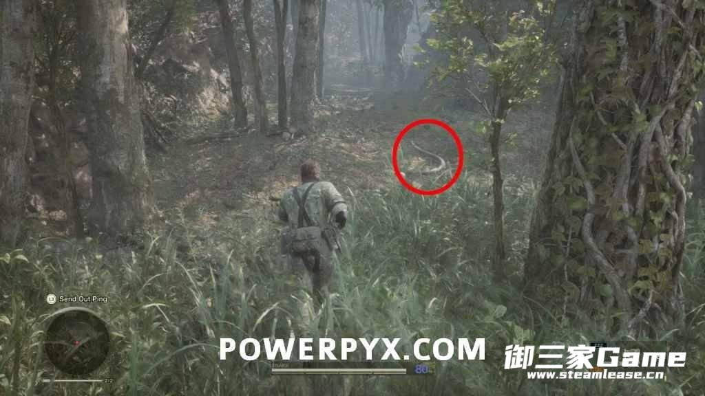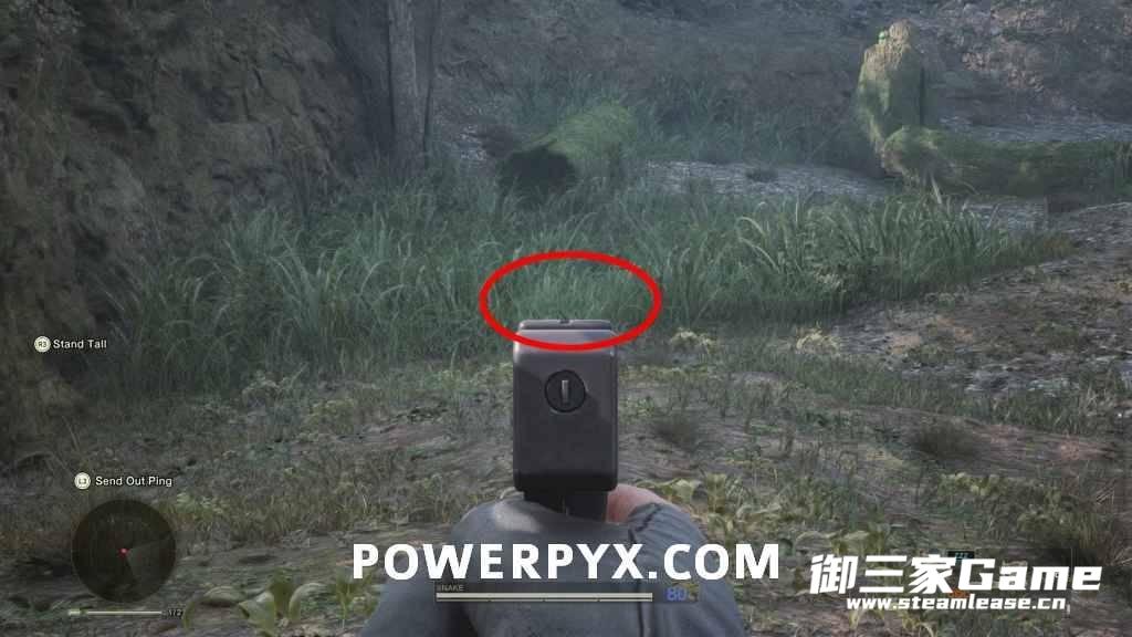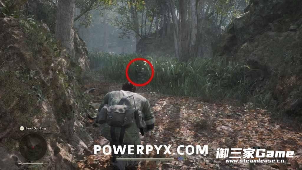 拿到背包后返回起始位置,在之前爬行过的原木附近的草丛里可以看到有青蛙在跳,在非常容易难度下可以使用红外夜视镜来快速定位(按住方向键-左后按L3标记)。因为颜色相近比较难找,建议趴在草丛附近留意草叶的晃动。