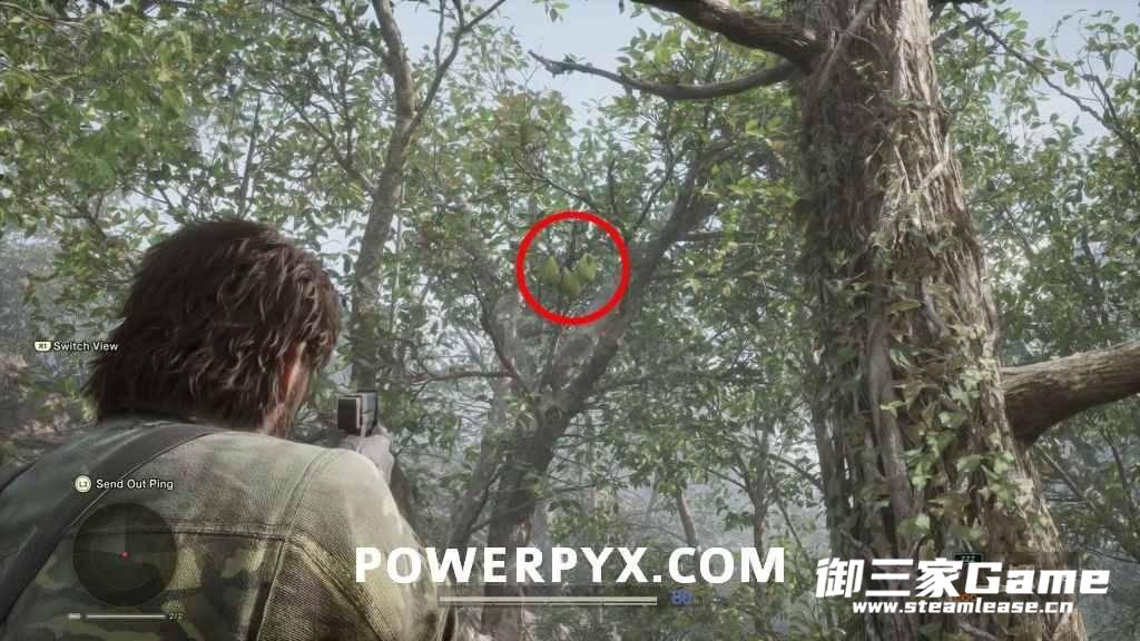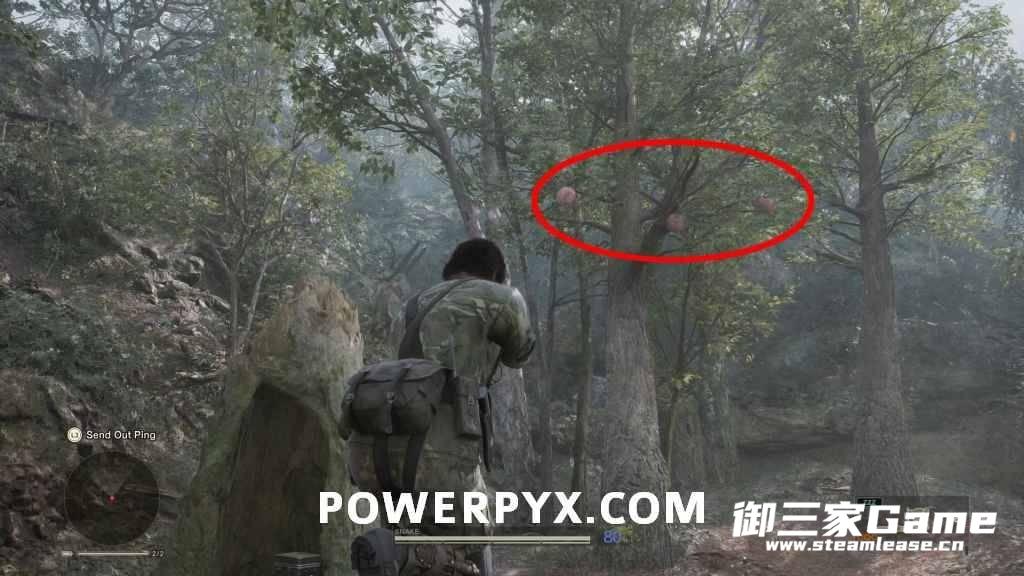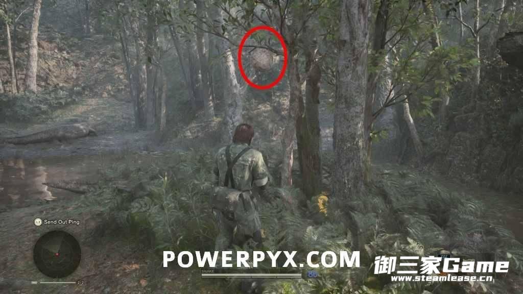 进入此区域后,往第一个巡逻的守卫右侧的树上看,就挂在高处树枝上,像黄绿色的梨。