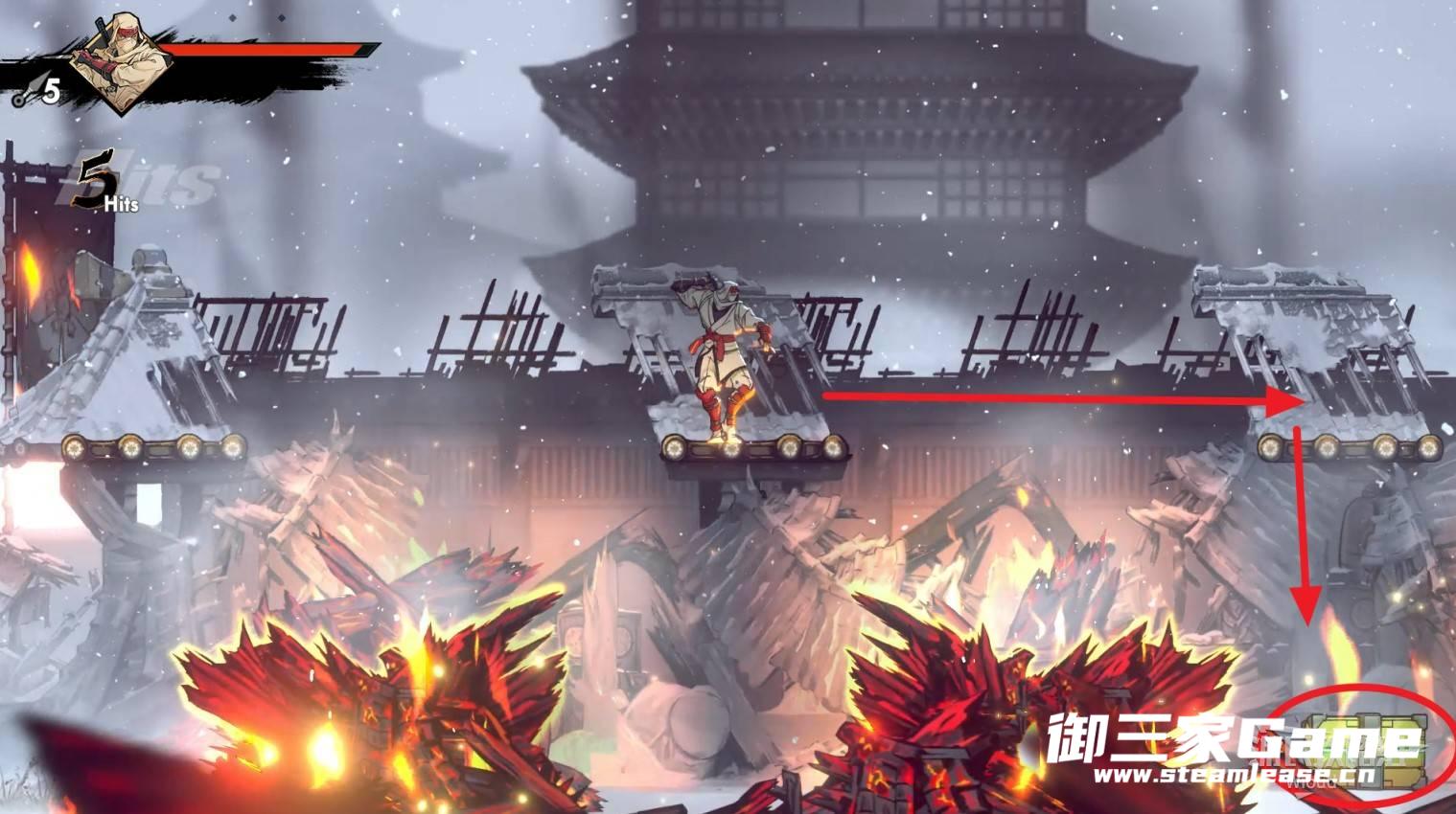 注意区域燃烧的火堆,主角只要碰到这种陷阱会立刻死亡,并消耗部分血量在旁边复活。