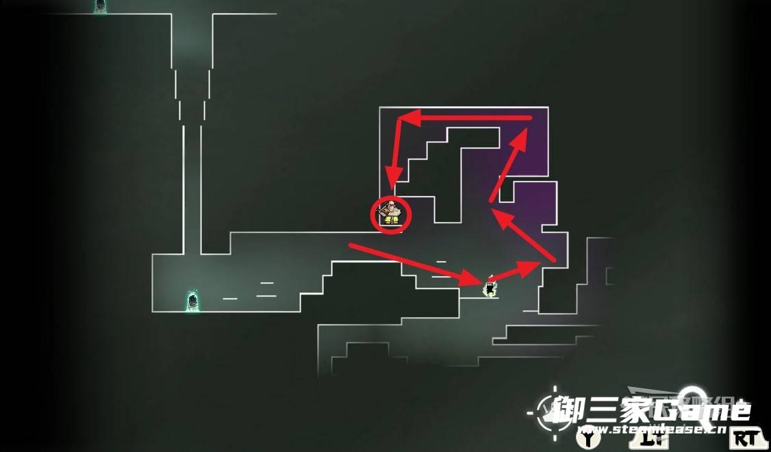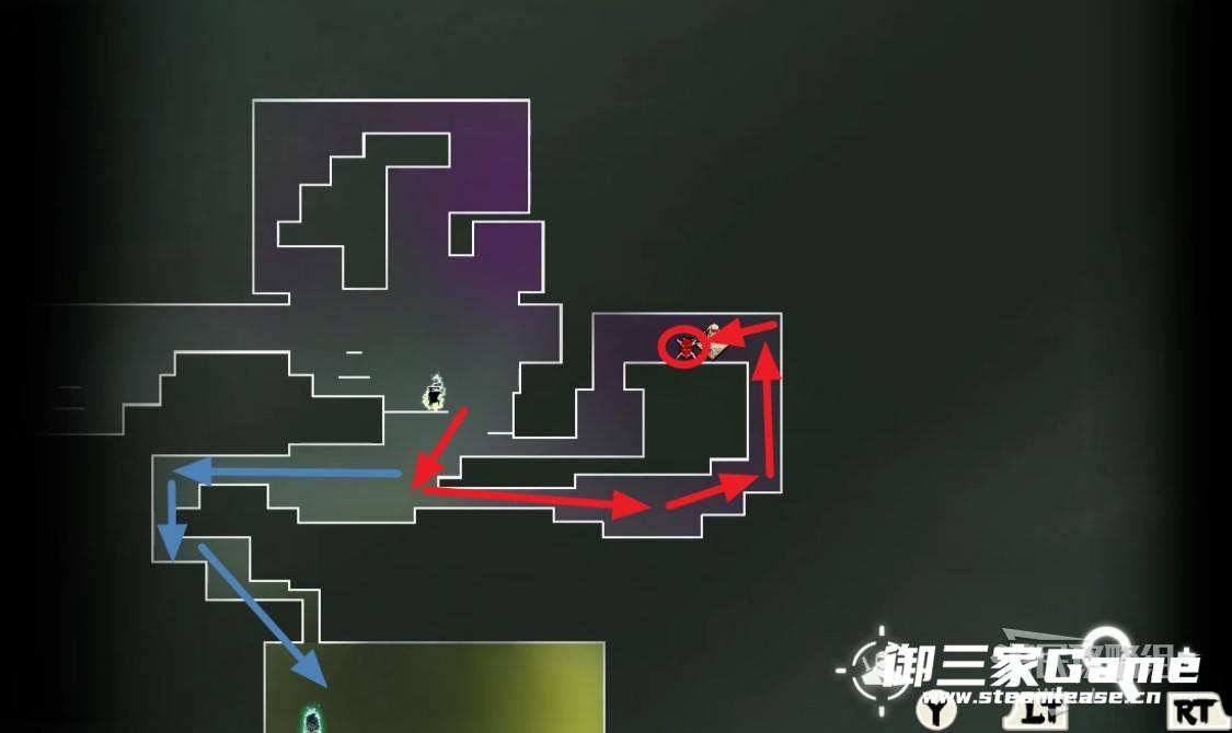 继续沿着下图红色箭头走右侧通道,绕到上层会找到最后一支【精英部队】。