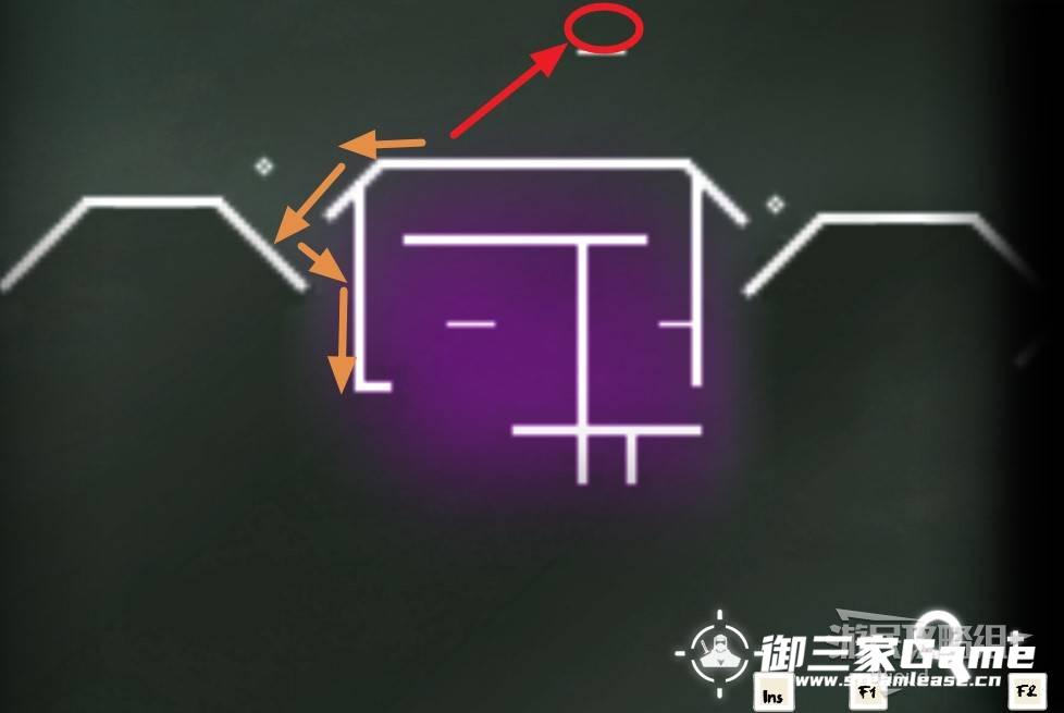往右走到第四个屋顶上,地图看这个屋顶下方是发紫的。