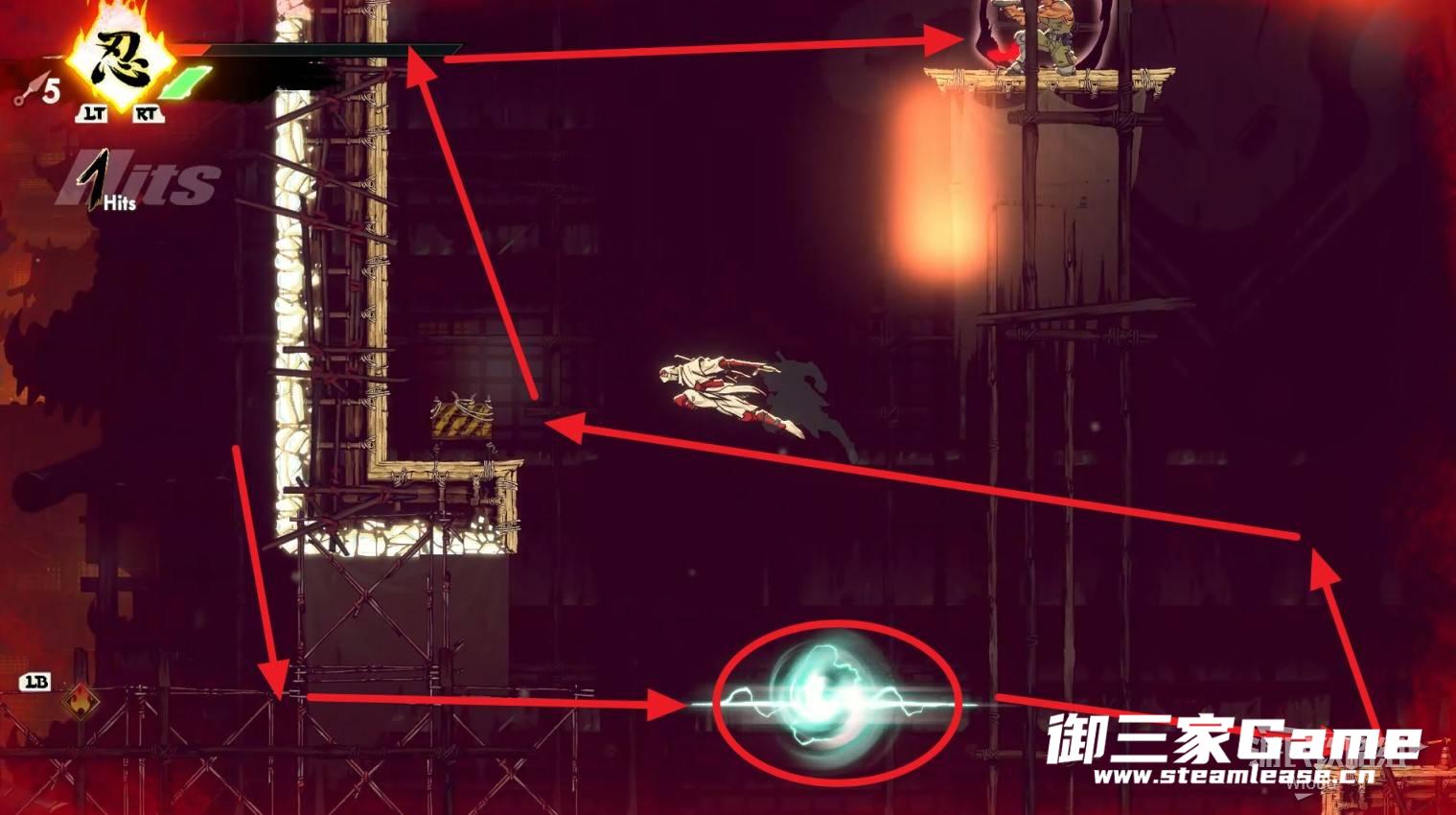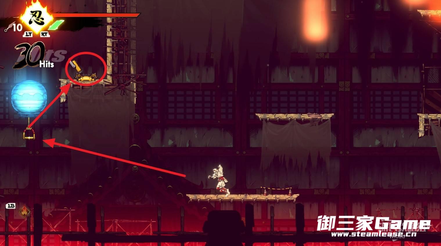 回到屋顶往右走,尽头跳到紫色灯笼上缓缓下落,底部会看到一个能量球,衔接能量球往右边平台冲。