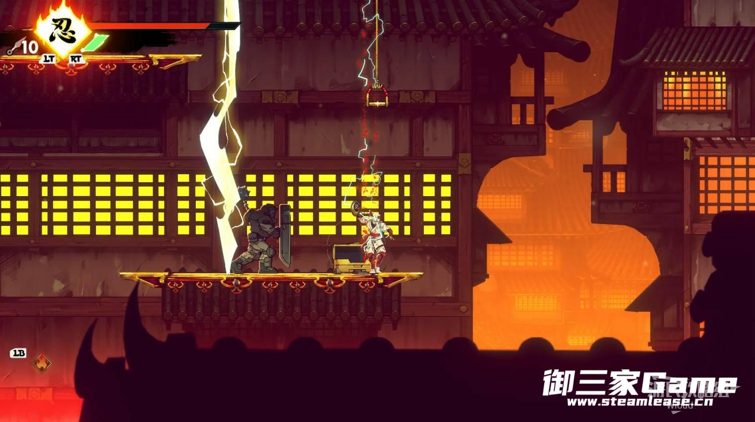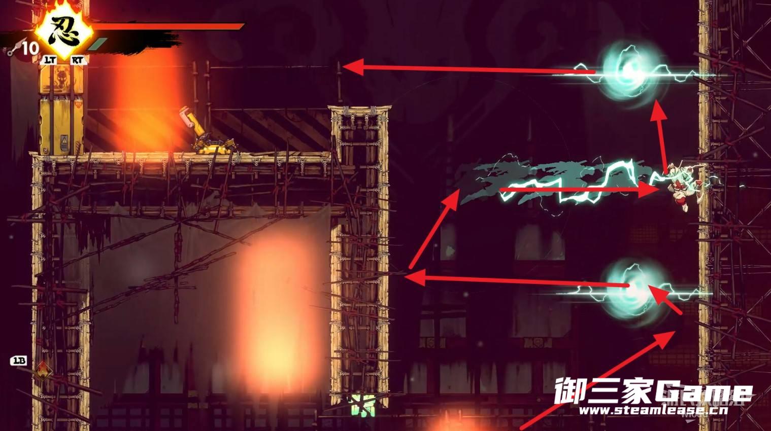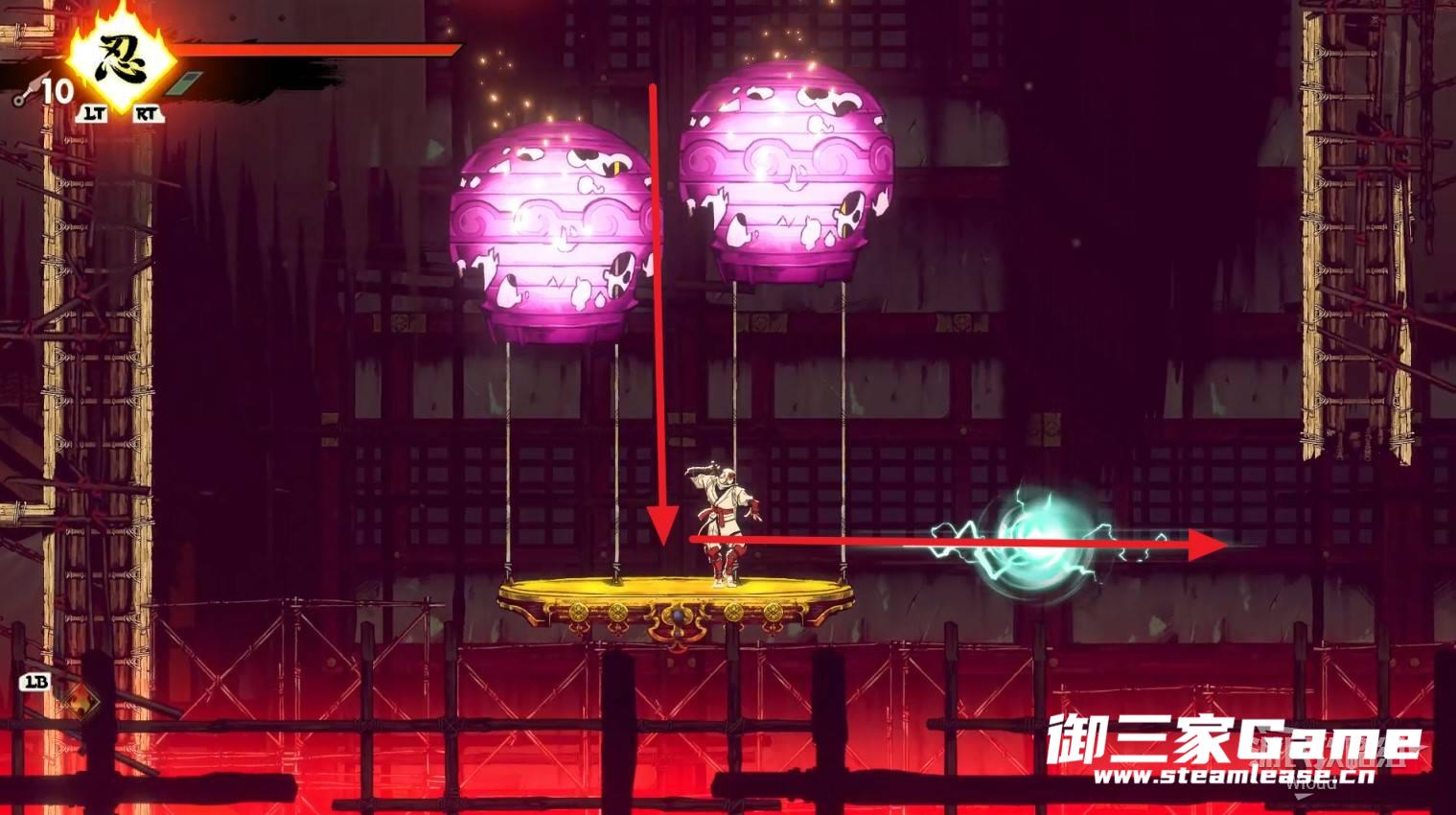 完成精英部队的挑战后,通过右边的灯笼把手跳到右侧第一个屋顶上,注意蓝色灯笼可随意使用,但紫色灯笼玩家站立时会慢慢往下降落,在一些机关处降落到低点会直接死亡。