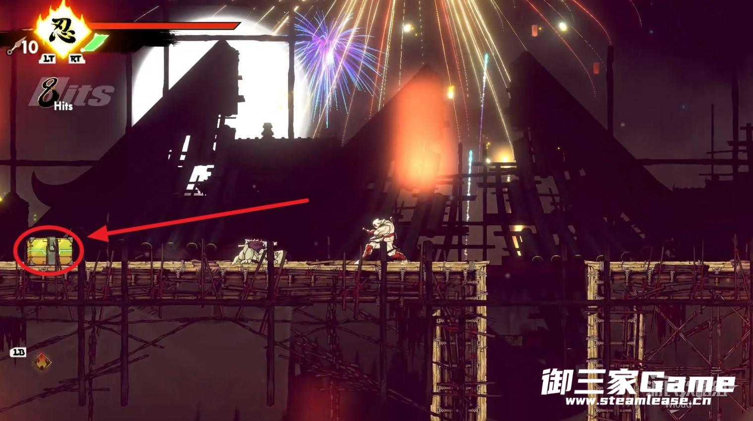 通过中间的紫色灯笼下去往右走,沿着平台逐渐跳到右侧底层。