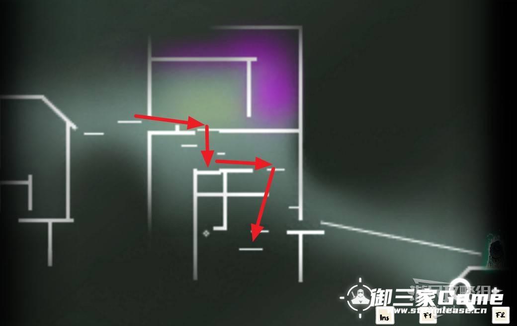 继续往右走,进入右边新的楼房时会发现右边有个紫色区域,目前无法过去,直接无视。