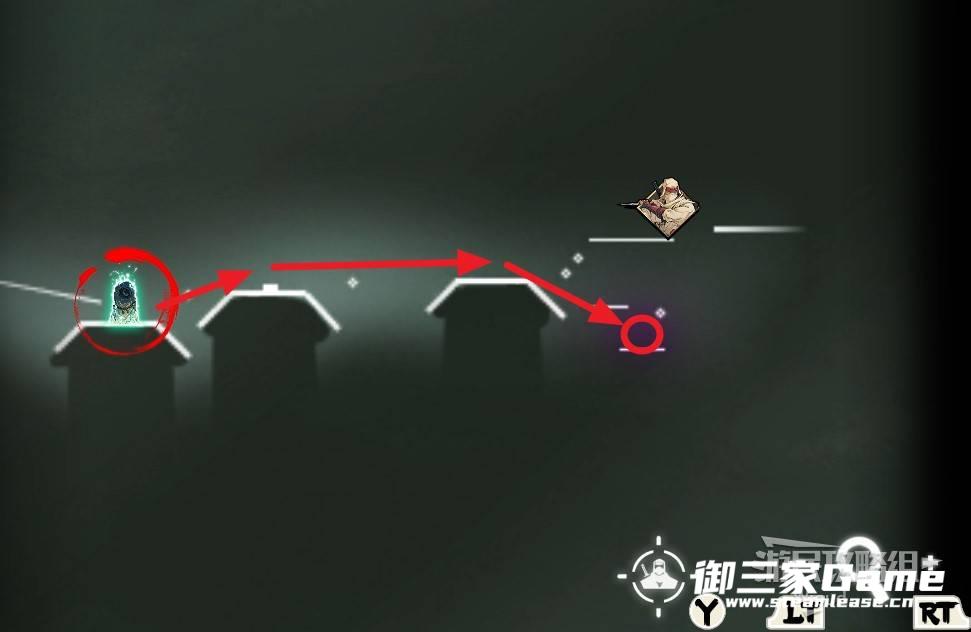 沿着下图箭头所示路线,移动到最右侧屋顶右下角的平台处。