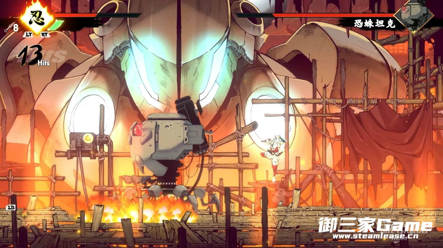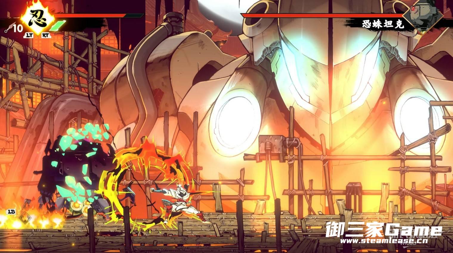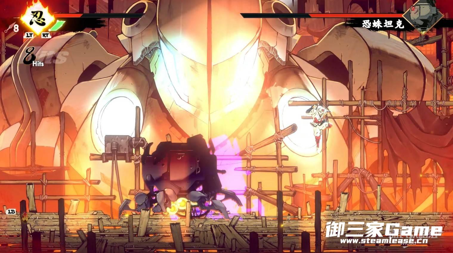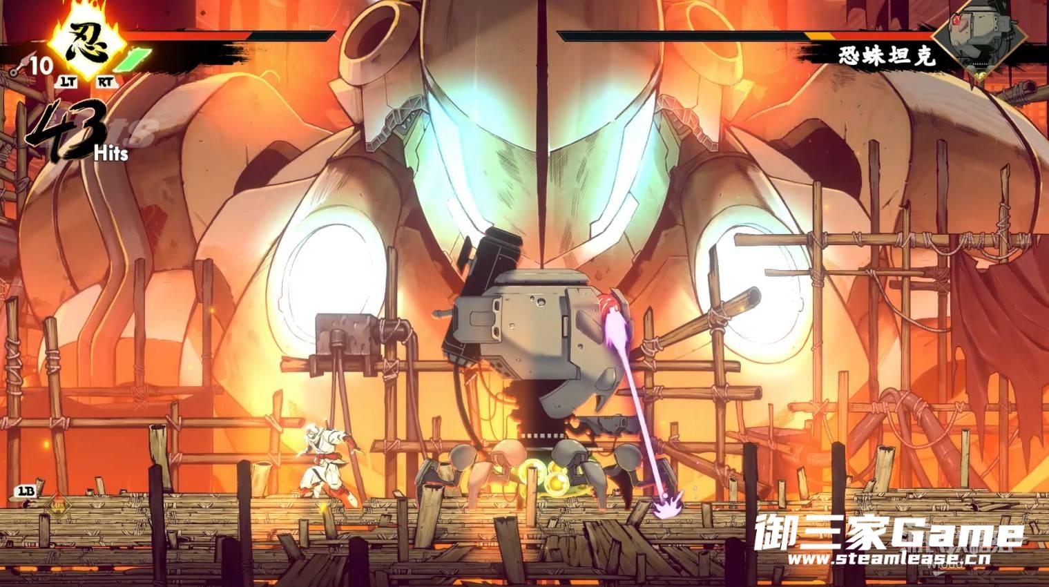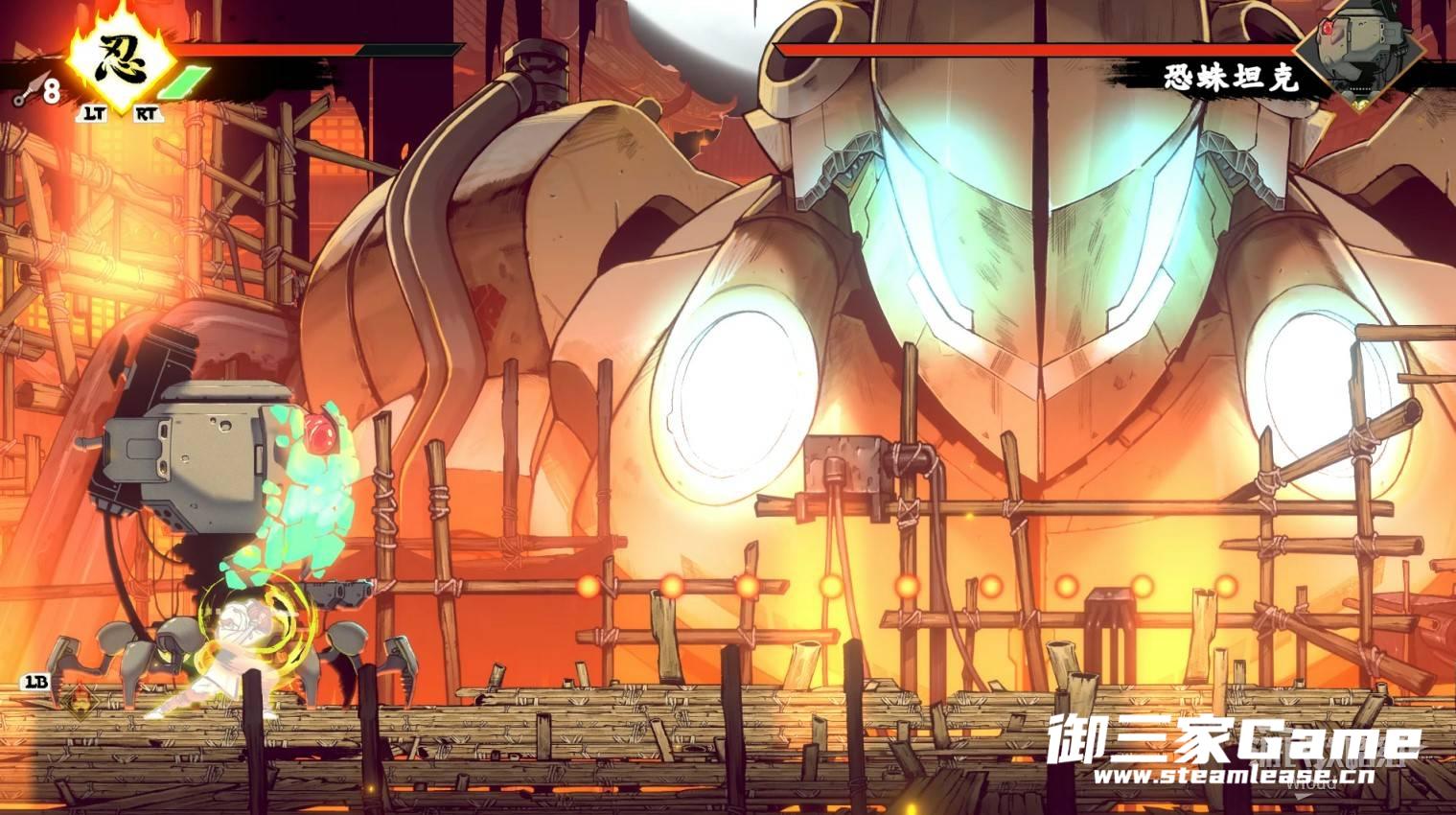 第二种紫色攻击它会先朝地面射出激光然后逐渐上抬角度,因为激光会先朝地面射击一段时间,看到激光立刻跳跃移动到另一侧在背面攻击BOSS即可,将BOSS击败可获得【忍法·雷闪】。