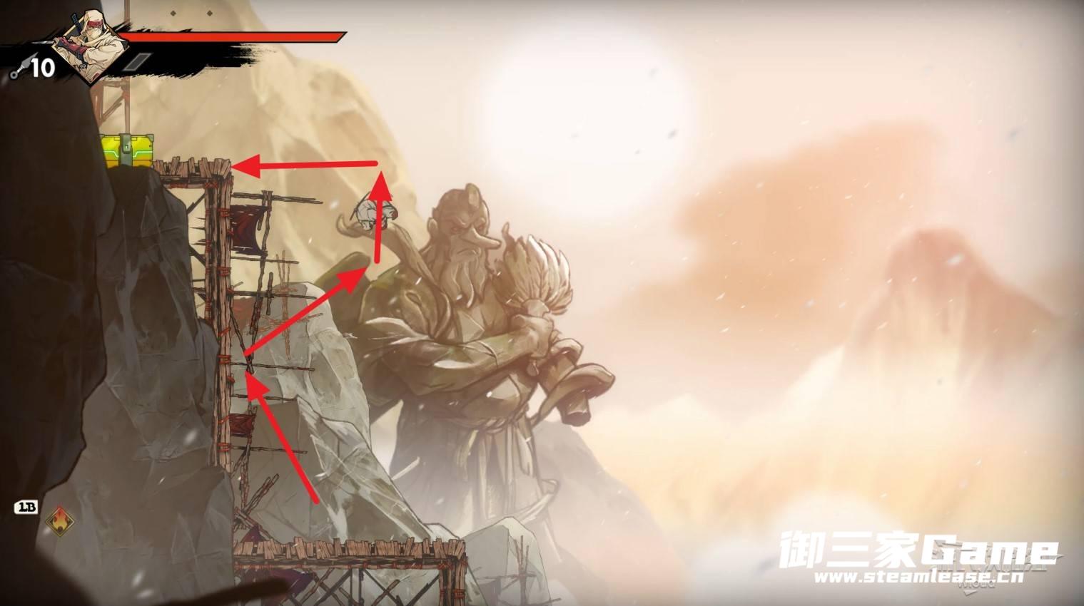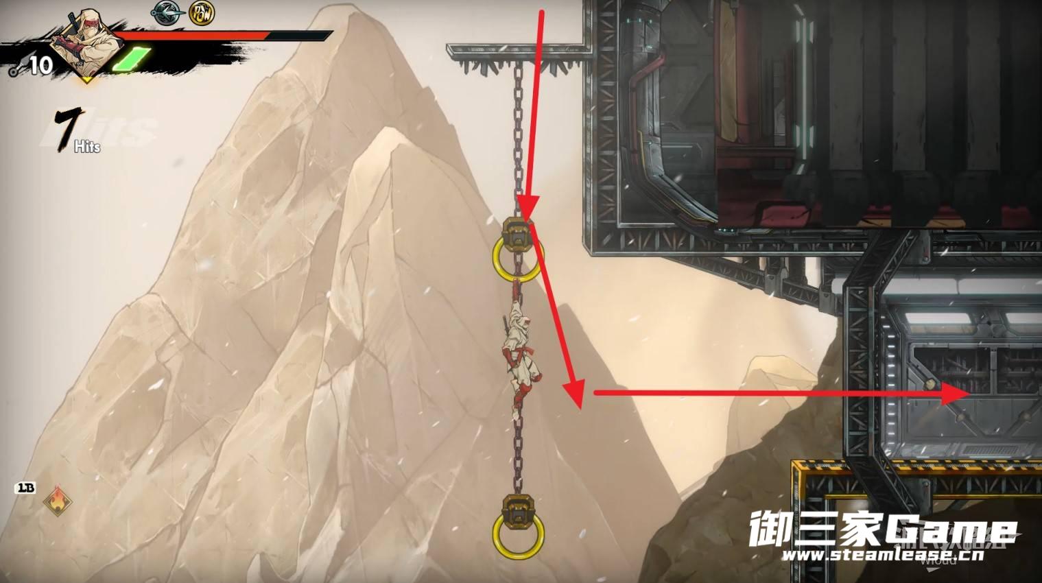 石碑的位置往右直走到边缘,边缘下方有可以抓握的圆环,先下落到最下方的圆环再跳到左侧通道内,里面有个容易漏的金钱宝箱。