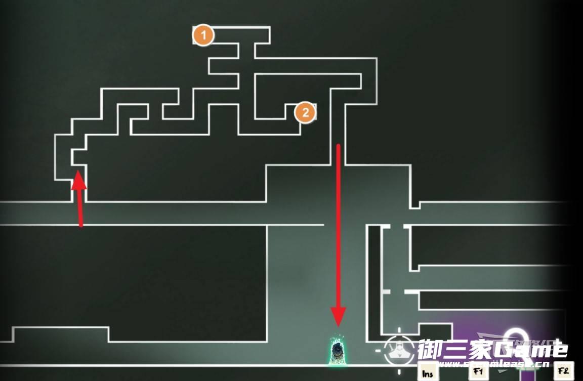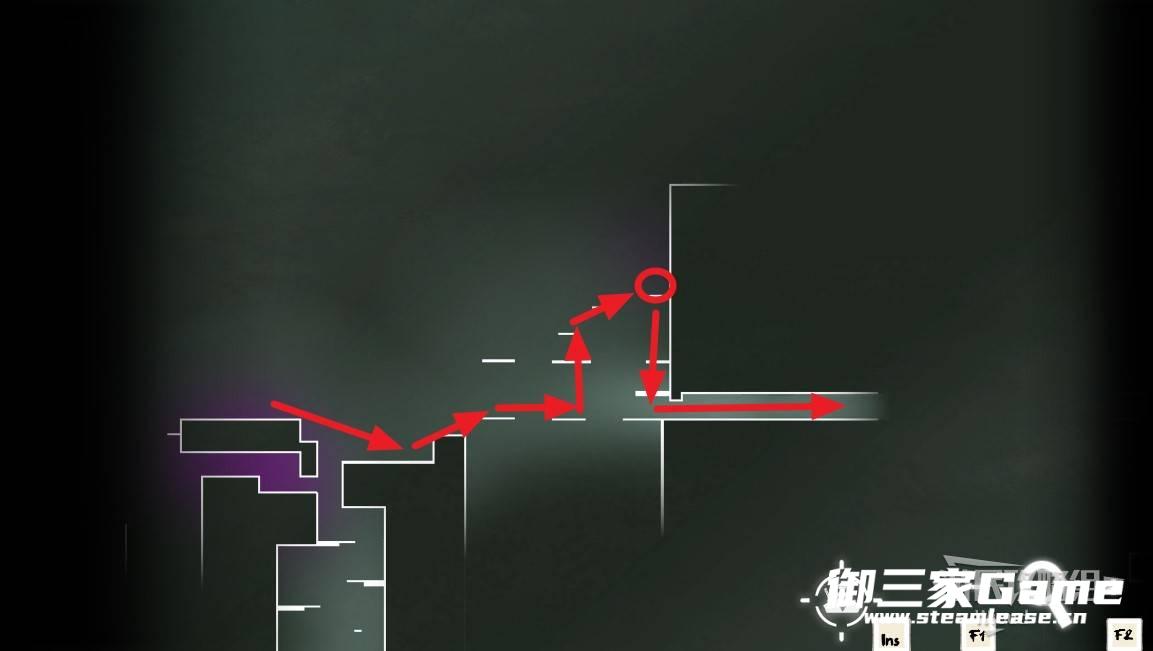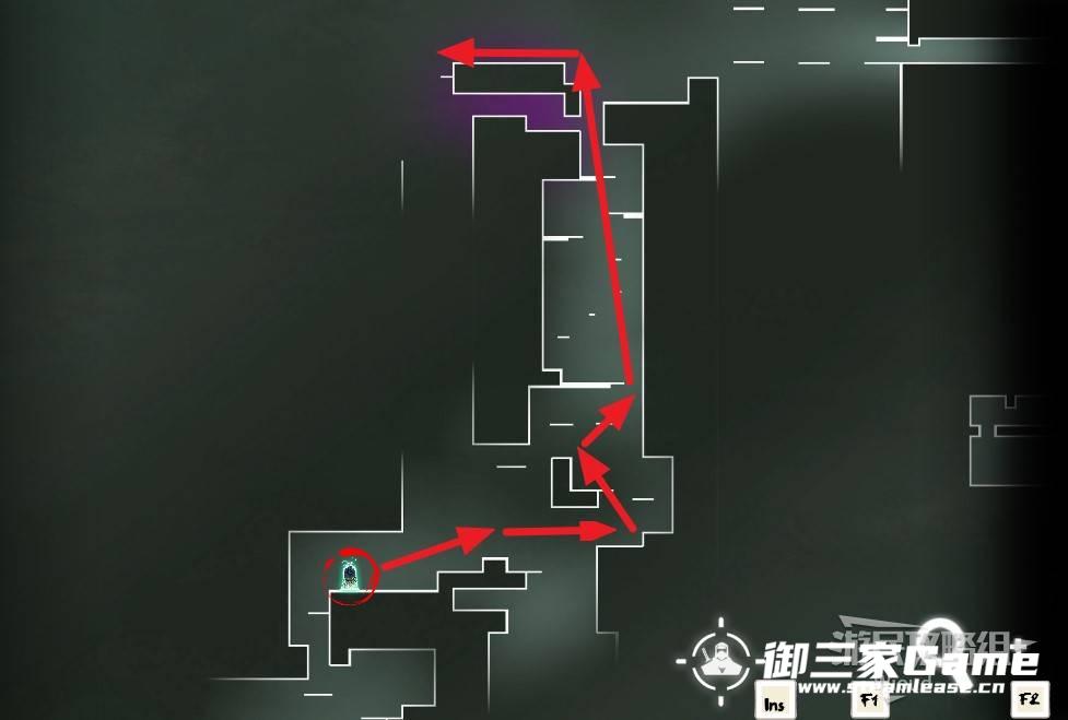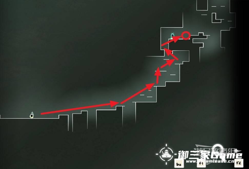 从精英部队的位置沿着下图路线往右走到头再逐级往上走到顶,顶部左侧走到边缘。
