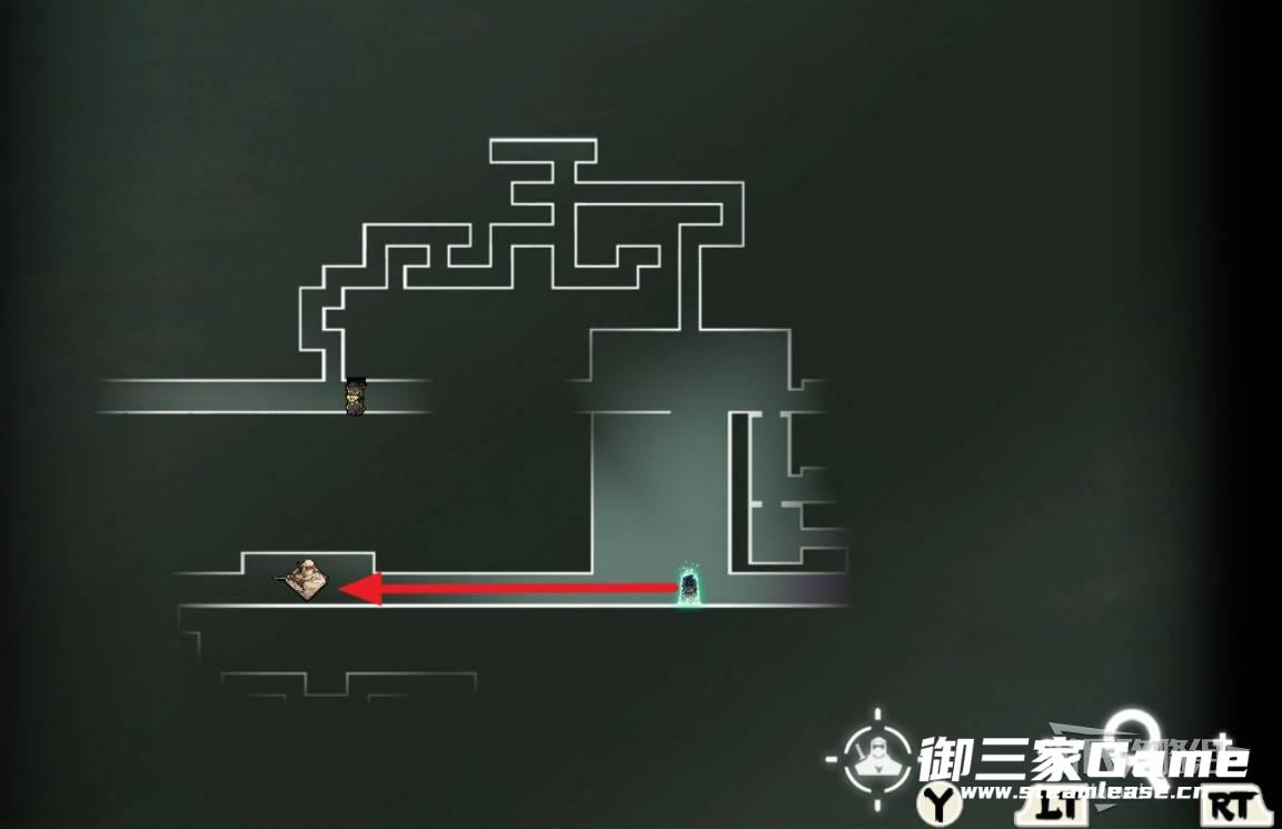 继续往左走到头会找到一个小宝箱,然后钻入宝箱旁边向下的通道。