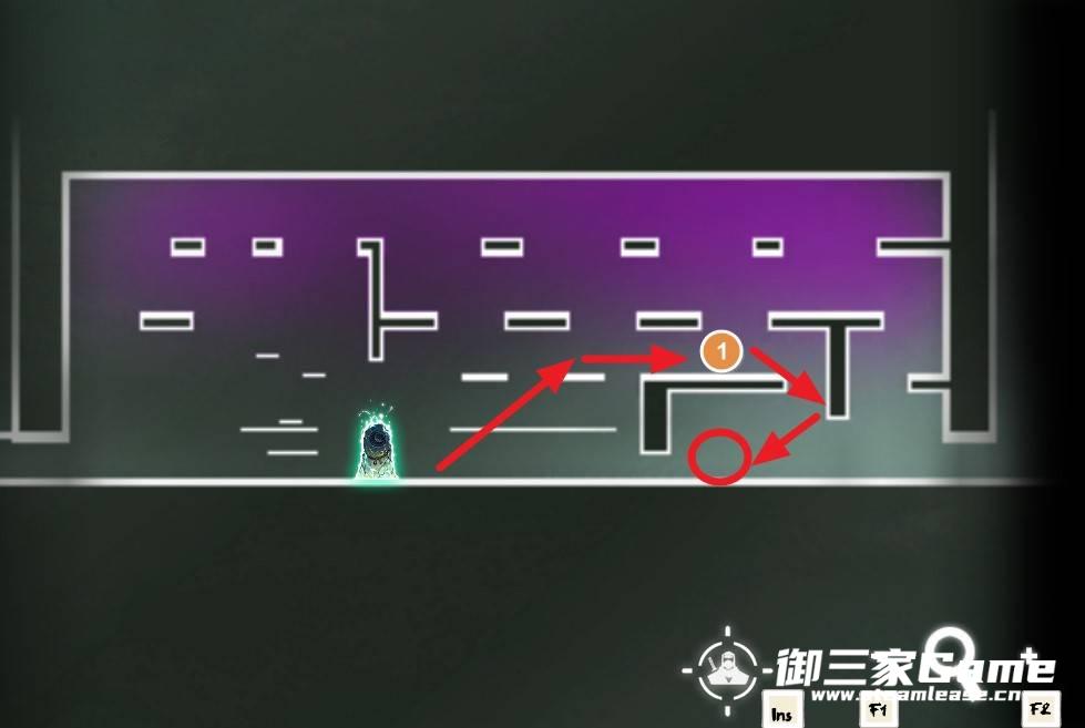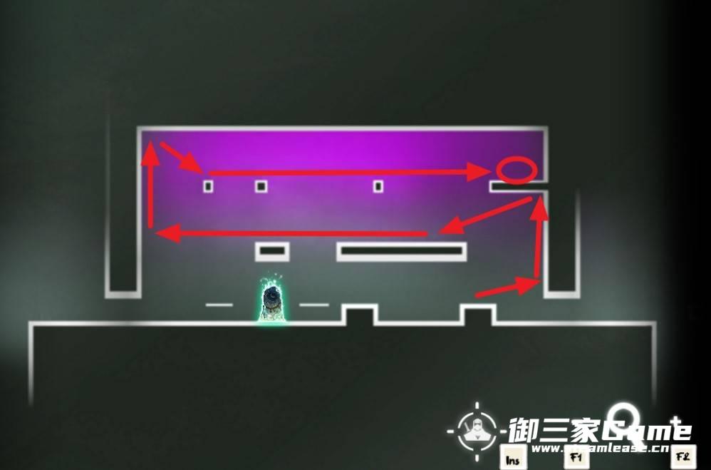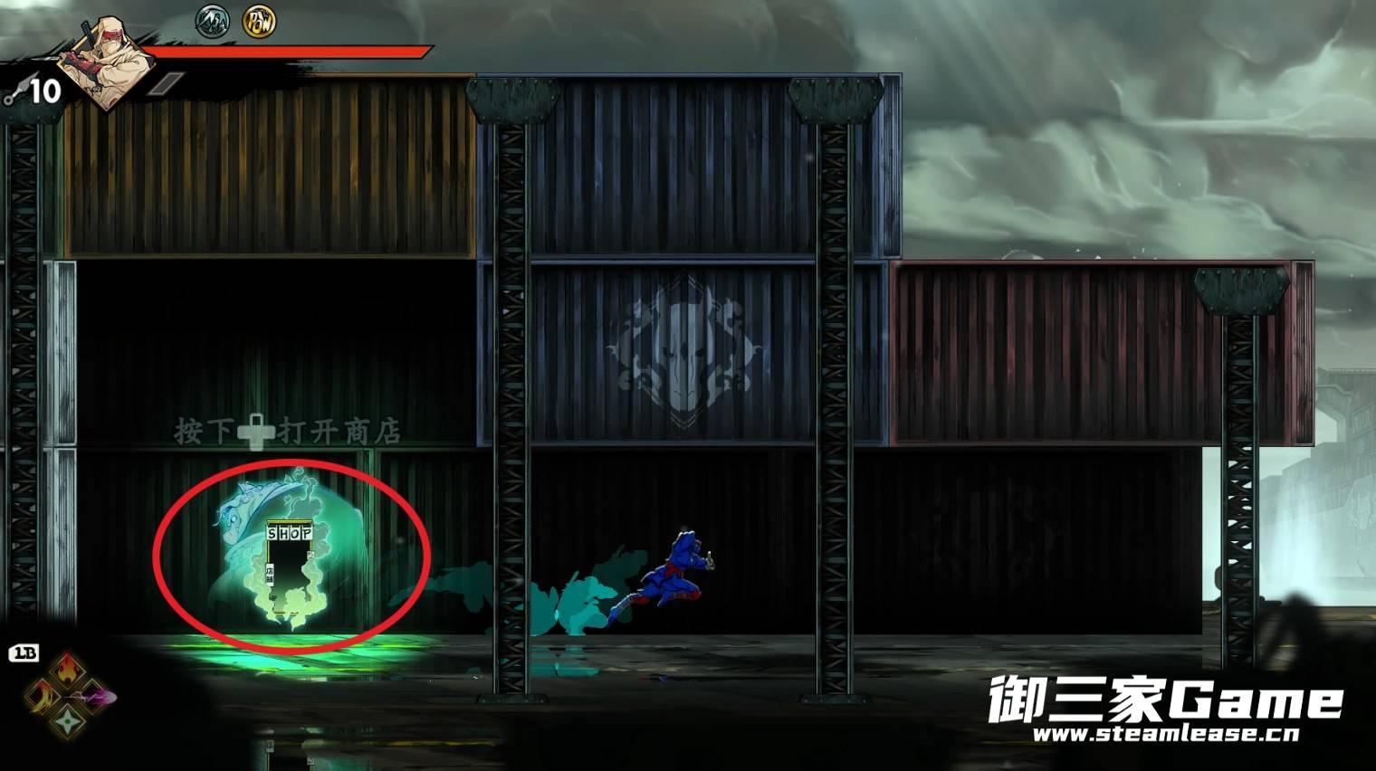 沿着下图红色箭头跳到右边平台上找到一个宝箱,开启获得护符【业火】,从平台右边跳下去激活左侧红圈所示的机关,此时建筑左侧的章鱼开始转圈。