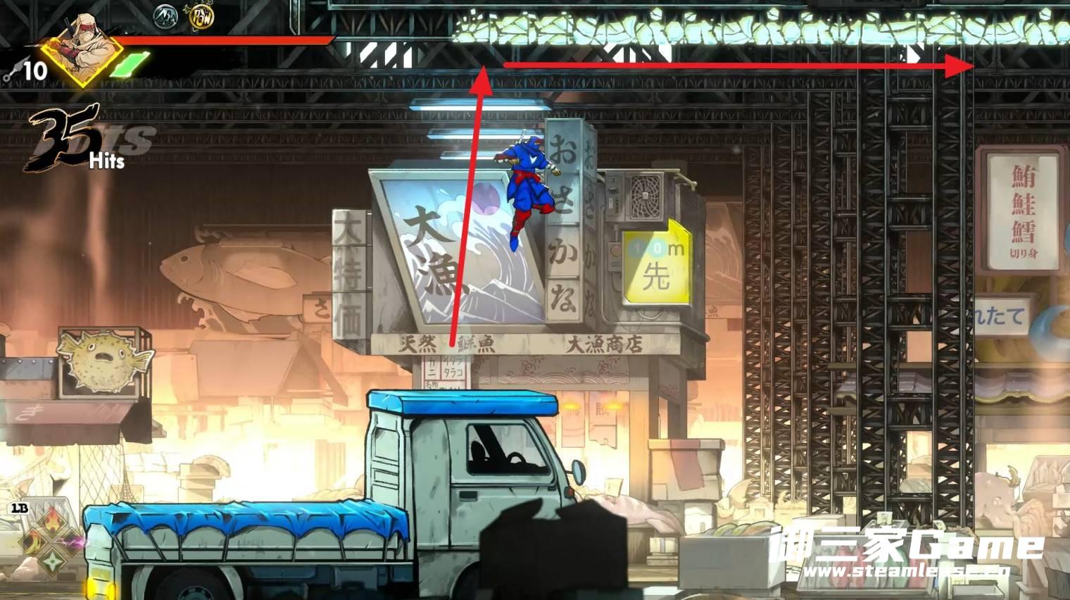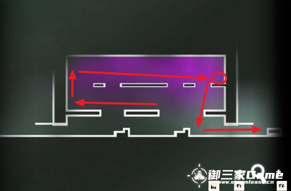 第二个建筑先清理周围敌人,然后走到右侧出口处,抓住出口上面的墙壁跳到中间平台,再连续跳到左侧墙壁绕到顶层平台并跳到右侧红圈所示平台处。