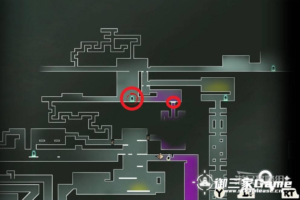 沿着红色路线爬到右侧紫色区域,需要抓爬能力,然后沿着红色路线拿到红色标识1处的宝箱,可获得【胧珠】。