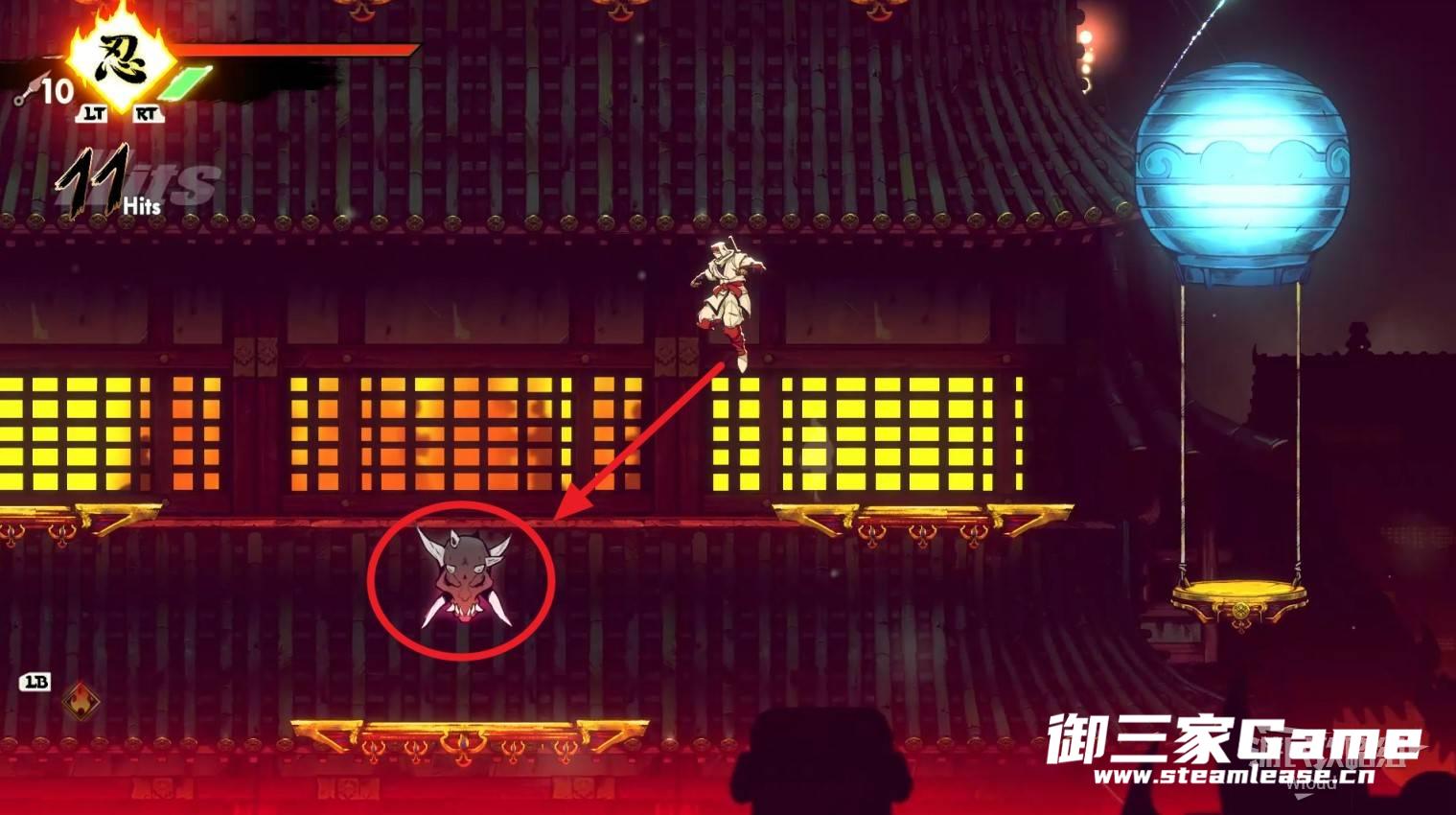 完成精英部队的挑战后,通过右边的灯笼把手跳到右侧第一个屋顶上,注意蓝色灯笼可随意使用,但紫色灯笼玩家站立时会慢慢往下降落,在一些机关处降落到低点会直接死亡。