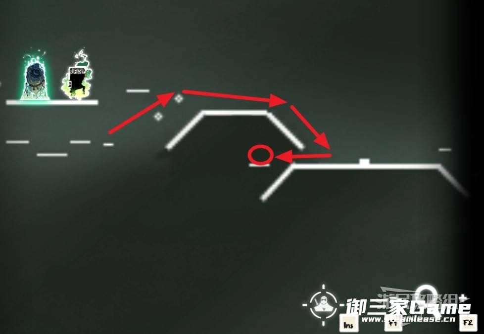 石碑位置沿着下图路线往正下方平台移动,会发现第一个【精英部队】,攻击鬼头图标会刷几波怪。