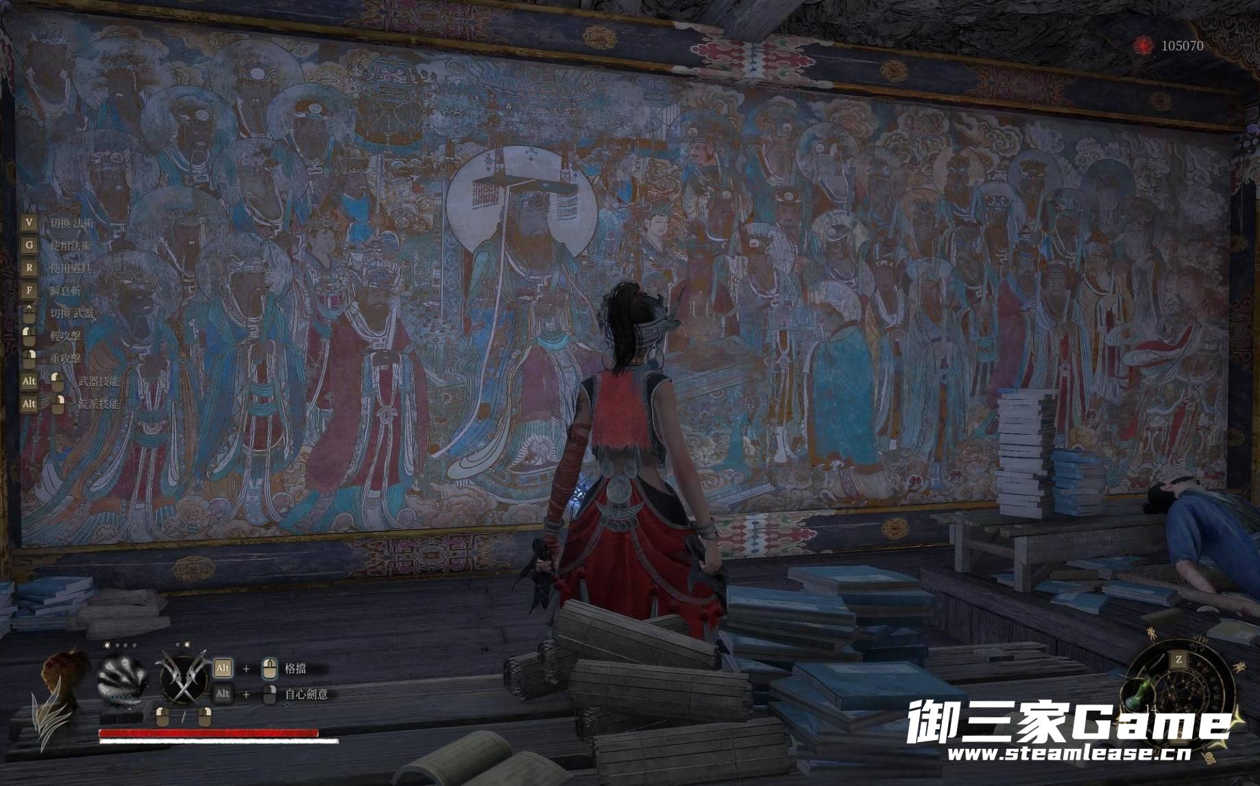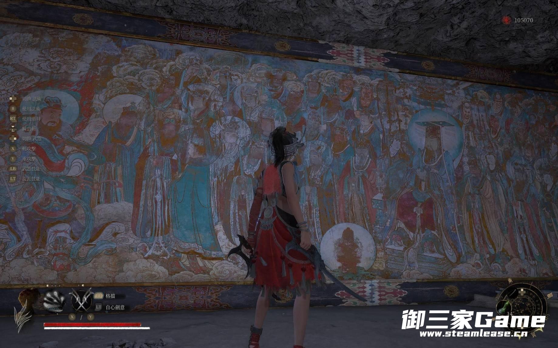 一二楼的墙壁都有,这是现实中真正有的东西,而且相当有名,原图位于山西省芮城县永乐宫主殿三清殿,叫做朝元图,又称为永乐宫壁画,它是元朝时候的作品,总共由七人共同绘制完成,高4.26米,长达94.68米,内容是道教诸神朝拜元始天尊的场景,总共绘制了286位道教神仙,这些神仙平均身高都在两米以上,不知道游戏有没有全数收录啦,但路过这边的时候不防可以停下脚步欣赏下壁画,这边场景比较黑,可以把提灯给挂上。