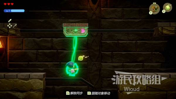 同步:对着可移动的物品按下X键使用同步能力,将身旁的托力发射出去附身到这个物体上,此时塞尔达与目标都发出绿光,可以带着这个物体四处移动;同步能力对某些怪物也有用。